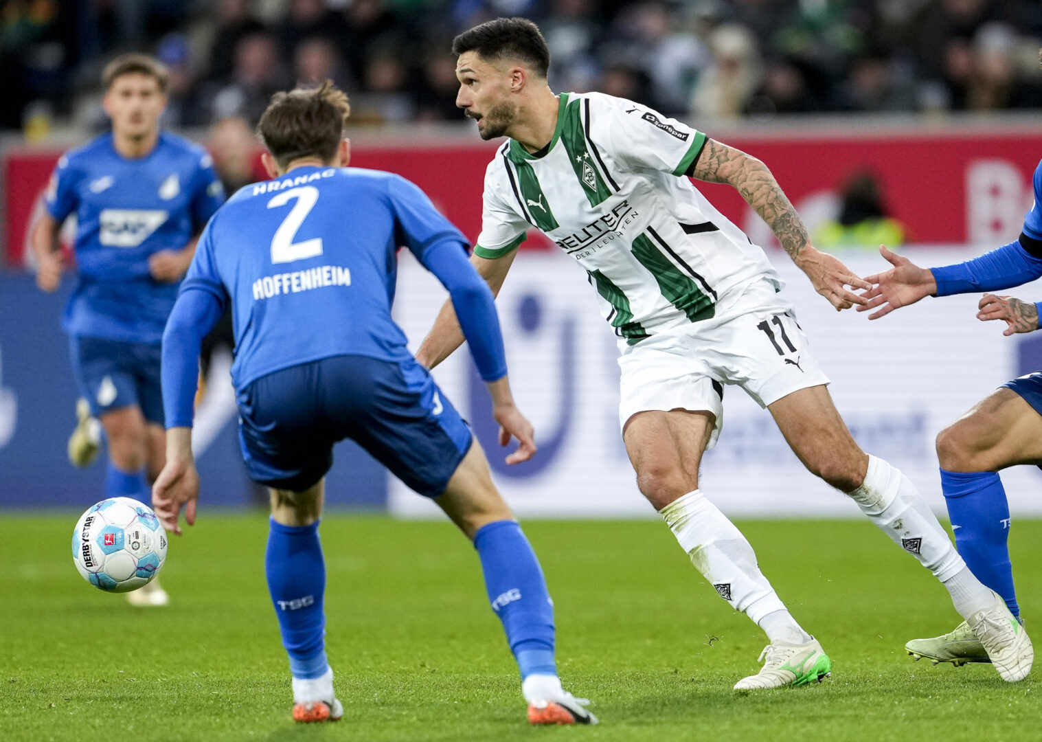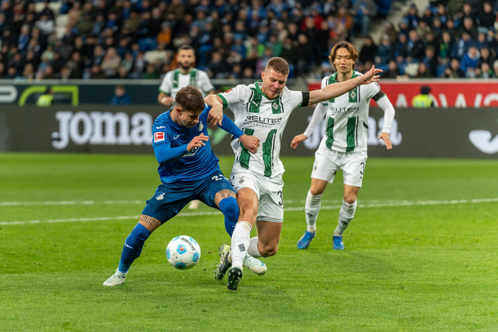 Doch die Hoffenheimer hielten sich weiter an ihr Spielsystem und konnten vor der Pause durch Arthur Chaves auf 1:2 verkürzen. Nachdem VfL-Keeper Omlin einen Hlozek-Schuss noch abwehren konnte, drückte der Innenverteidiger den Ball aus kurzer Distanz mit seinem Hoffenheimer Premierentreffer über die Linie (43.). Es blieb bei der knappen Borussen-Halbzeitführung, wobei die mutig nach vorne spielenden Kraichgauer zwar mehr Ballbesitz hatten, aber die Fohlen dagegen die Mehrzahl an Torchancen.