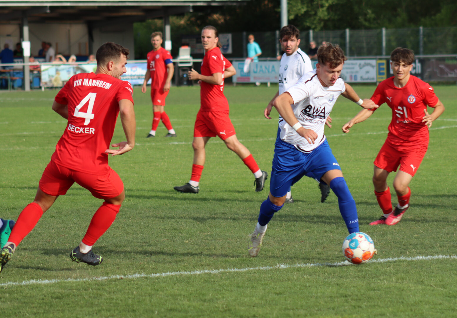 Bei optimalen äußeren Bedingungen legten die Gäste aus der Quadratestadt gleich mächtig los. Ein Angriff nach dem anderen rollte in Richtung gegnerisches Tor. Und so stand es nach einer Viertelstunde nach zwei herrlichen Treffern von Arthee bereits 2:0 (7., 15.). Nur sieben Minuten später nutzte Sahiti einen Rohrbacher Fehler in der Defensive und erhöhte auf 3:0 (27.). Die Gastgeber wurden komplett in die Defensive gedrängt und konnten keine Entlastungsangriffe kreieren. Bezeichnend, dass der VfR-Keeper Paul Lawall nach einer halben Stunde Spielzeit nur zwei Ballkontakte nach Rückpässen seiner Vorderleute zu verzeichnen hatte.