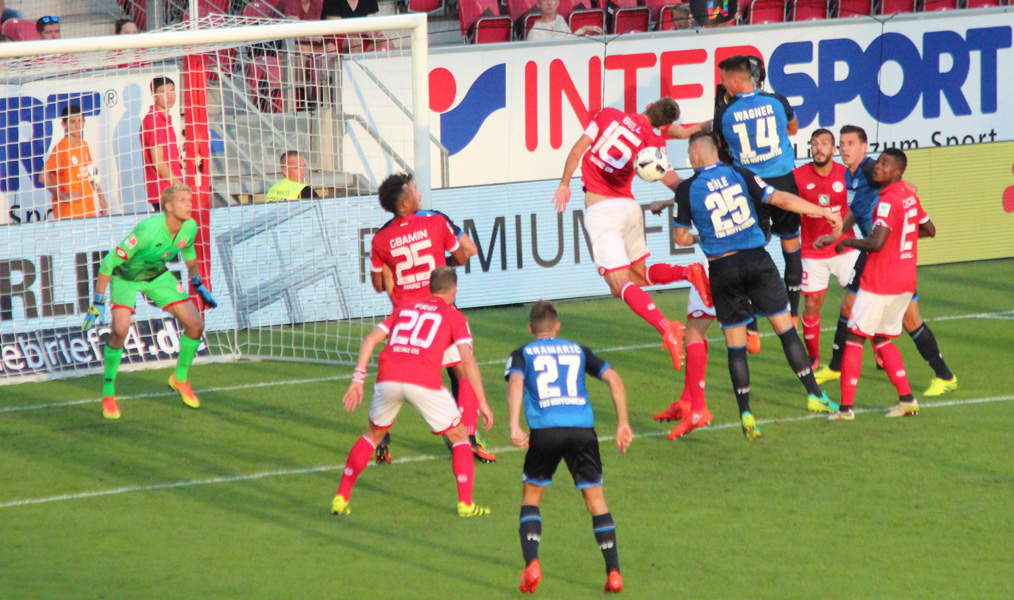 Das Sonntagsspiel der Fußball-Bundesliga am 2. Spieltag zwischen dem FSV Mainz 05 und der TSG 1899 Hoffenheim geht in die Bundesligageschichte ein. In einem außergewöhnlichen Torfestival trennten sich beide Kontrahenten letztlich leistungsgerecht mit 4:4. Die Nullfünfer lagen zur Pause bereits souverän nach zwei Treffern des mit 1,65 Meter kleinsten Bundesligaspielers Pablo De Blasis (3. /23.), Jhon Córdoba (27.) und Levin Öztunali (43.), bei einem Gegentreffer von Sandro Wagner (39.), mit 4:1 vor 27.408 begeisterten rot-weißen Fans in Führung. Die TSG spielte zwar nicht schlecht nach vorne und hatte Pech, als Andrej Kramaric am Pfosten scheiterte, doch aufgrund einer desolaten Abwehrleistung schienen die Felle schon früh davon zu schwimmen.