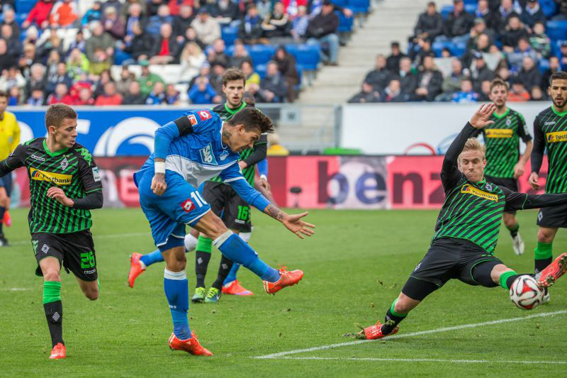 Die ersatzgeschwächten Gastgeber begannen sehr konzentriert und offensiv. In den ersten 20 Minuten waren sie tonangebend, brachten die Gladbacher in starke Bedrängnis. Nach sechs Minuten bereits der erste Torjubel. Steven Zuber schoss aus kurzer Distanz wuchtig in die Maschen. Doch der wenig überzeugende Schiri Thorsten Kinhöfer aus Herne verweigerte zu Unrecht den Treffer des Schweizers wegen angeblichem Abseits. Die Blau-Weißen ließen sich davon nicht beirren, drückten weiter aufs Tempo und gingen nach herrlicher Kombination über Volland und Firmino durch Schipplock in der 17. Minute 1:0 in Führung.