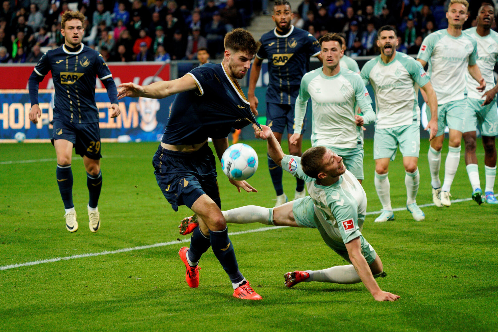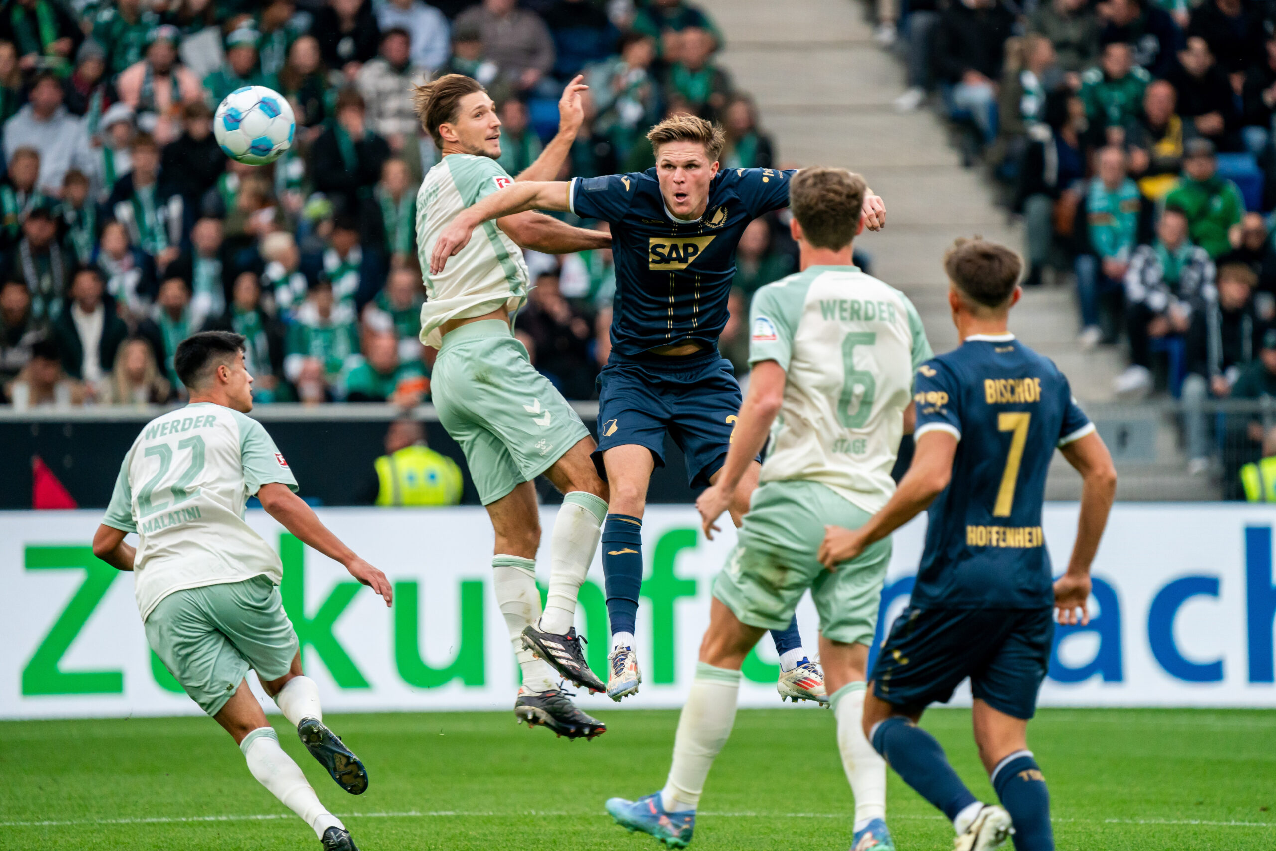Es ist vor allem die Art und Weise, wie die TSG leichtfertig Gegentreffer kassiert. Dies ist alles andere als erstligareif. Der 1:3-Anschlusstreffer der Grün-Weißen entstand aus dem Strafraum-Gewusel heraus, wo Malatini aus acht Metern im Liegen den Ball über die Torlinie stochert. Beim 2:3 kann Stage unbedrängt einköpfen und nur wenige Minuten später kommt er beim Ausgleichstreffer aus fünf Metern frei vor dem Tor zum Abschluss. Bei seinem dritten Treffer kurz nach Wiederanpfiff kam Stage nach einer Weiser-Flanke aus fünf Metern frei zum Kopfball. Dabei standen drei Gegenspieler unsortiert und ohne Zuweisung Spalier, ohne den Anschein zu erwecken, hier eventuell eingreifen zu müssen. Die Norddeutschen bestimmten weiter die Partie und man hatte den Eindruck, dass eher das 3:5 als ein möglicher Ausgleich fallen würde.