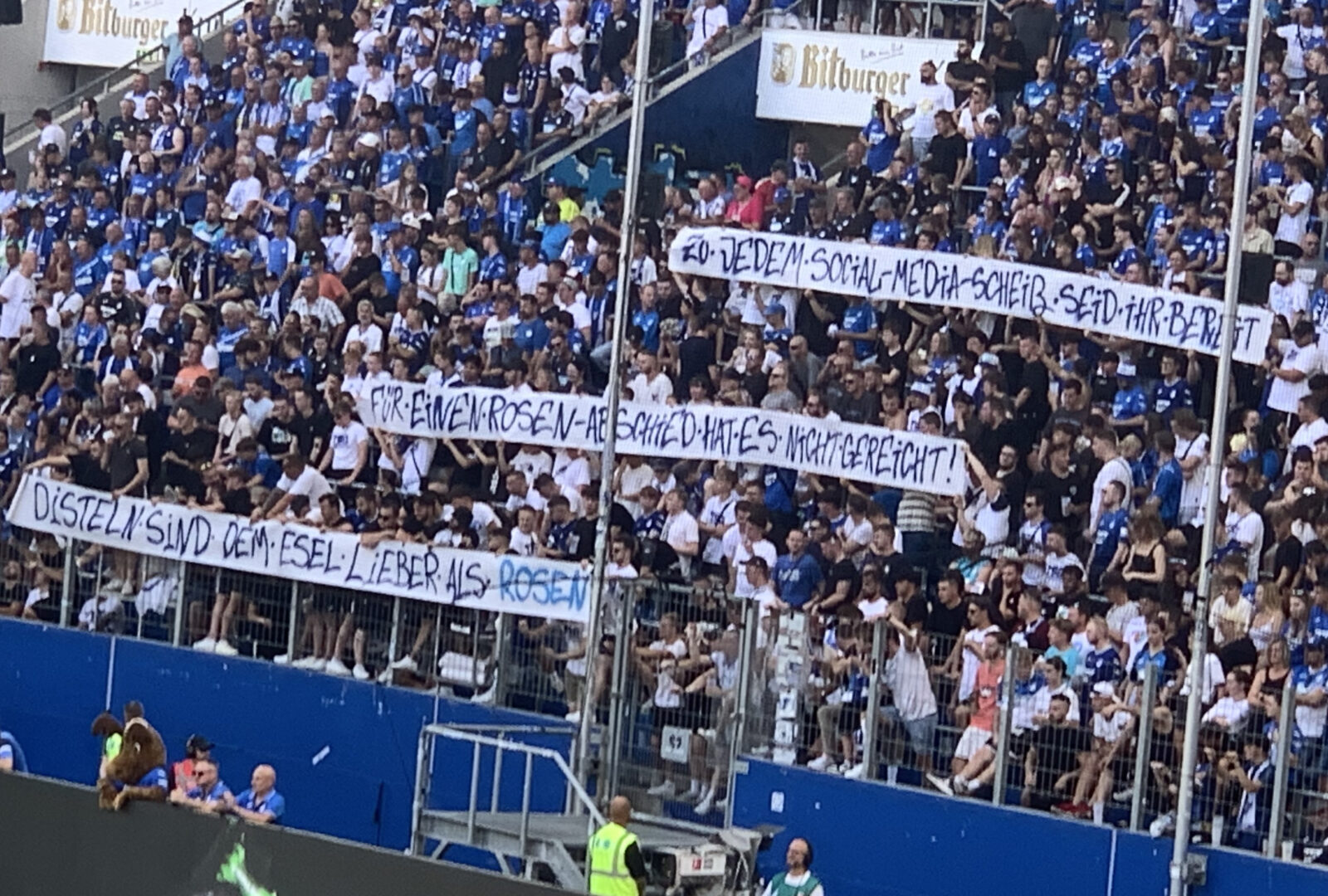 Die gesamte Partie stand unter dem Stimmungsboykott der TSG-Fans. Aus Wut und Enttäuschung über die Vereinspolitik, allen voran der Entlassung von Sport-Geschäftsführer Alexander Rosen, verzichteten die Südkurvenfans auf den gewohnten Support für ihre Mannschaft. In zahlreichen Spruchbändern brachten sie während der gesamten Partie ihren Unmut zum Ausdruck. An die 40 Spruchbänder wurden vor dem Anpfiff dem Verein – wie gefordert – angemeldet. Es war schon sehr gewöhnungsbedürftig, wie die rund 2.000 mitgereisten Gästefans in der PreZero-Arena unentwegt den Ton angaben.