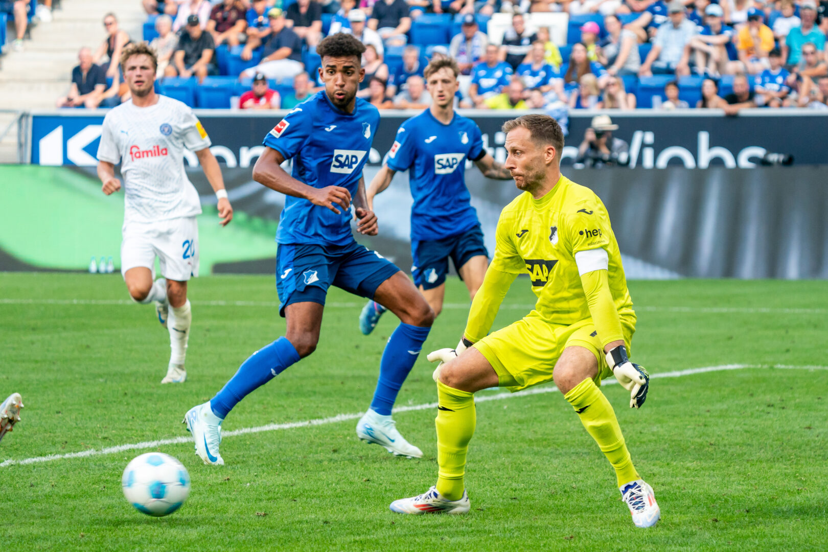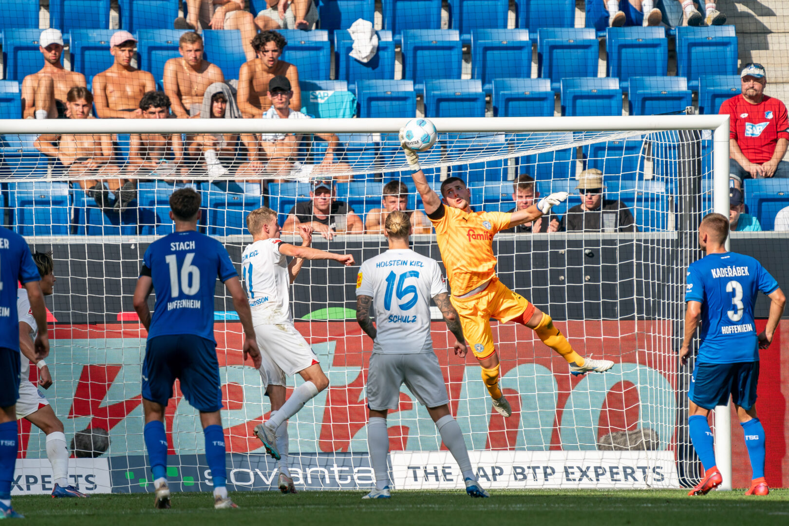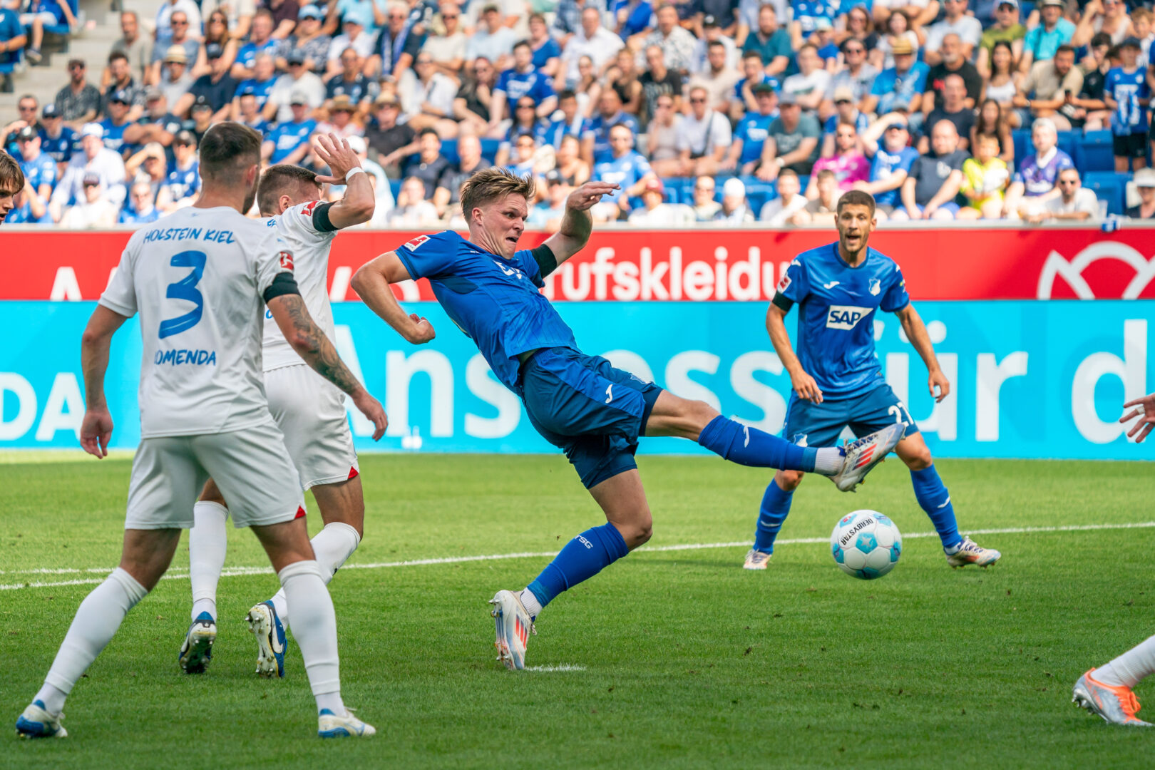 Im zweiten Abschnitt hätte Marius Bülter vorzeitig alles klar machen können, doch nach schöner Vorarbeit von Kramaric traf er frei vor dem Tor den Ball nicht (57.). Die Kieler wurden danach deutlich aktiver und erspielten sich eine Reihe guter Möglichkeiten. Bei den Gastgebern lief es bei weitem nicht mehr so flüssig wie in Hälfte 1 und so stand zunehmend Keeper Baumann im Mittelpunkt des Geschehens. Zunächst musste der TSG-Kapitän nach einer Stunde sein ganzes Können aufbieten, als er gegen Machino aus kurzer Distanz per Fußabwehr mit einer Weltklasseparade den Anschlusstreffer verhinderte (61.). Die Nordbadener hatten in dieser Phase viel Mühe mit den immer stärker werdenden Kieler Störchen und hatten vor allem in der Defensive ihre Mühe.