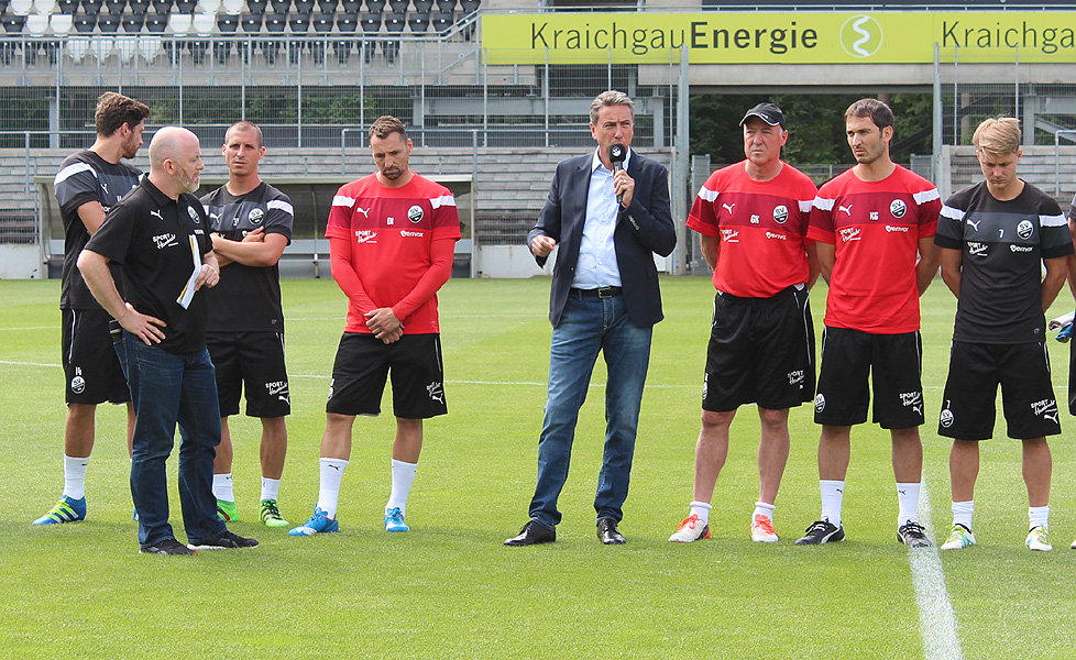 Bei herrlichem Sonnenschein stellte Sandhausens Stadionmoderator Wolfgang Hell auf dem neuen satten Grün des Hardtwaldstadions den neuen Spielerkader des SV Sandhausen für die Saison 2016/17 am vergangenen Sonntag den SVS-Fans vor. Für den 27 Spieler umfassenden Profikader, samt acht Neuzugängen, hat seit Wochenbeginn das Saisonvorbereitungsprogramm begonnen. Eine ganz wichtige Person fehlte dabei, nämlich Chef-Trainer Alois Schwartz. Er hatte am Vortag seinen Abschied in Richtung Ligakonkurrent 1. FC Nürnberg verkündet. Dort wird er die Nachfolge des zum belgischen Spitzenklub RSC Anderlecht gewechselten Coach Réne Weiler antreten. Die Enttäuschung bei den Kürpfälzern war verständlicherweise groß, zumal der Zeitpunkt des Wechsels alles andere als glücklich war.