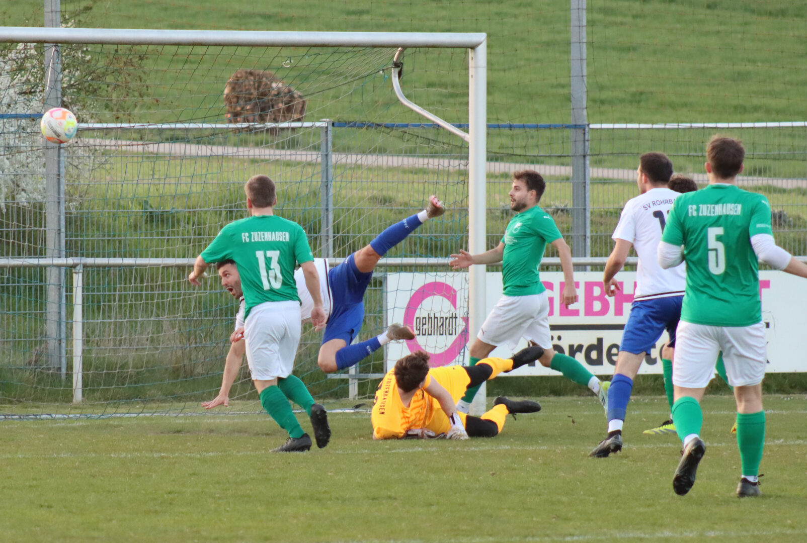 Der Tabellenführer erhöhte nun den Druck aufs gegnerische Tor und erspielte sich einige gute Möglichkeiten. So setzte Zimmermann per Kopfball den Ball auf die Querlatte (30.) und kurz vor der Halbzeitpause hatte Tim Karrer Pech, als sein Gewaltschuss aus 25 Metern von SV-Keeper Nico Romig aus dem linken Torwinkel gefischt wurde. Eine Wahnsinntat des Rohrbacher Schlussmanns! Die beste Chance in Hälfte 1 vor dem Pausenpfiff bot sich Luca Romig, der frei vor dem Tor gleich zwei Mal an der Fußabwehr den FC-Keepers scheiterte (32.). Die Zuschauer bekamen in der ersten Hälfte eine sehr unterhaltsame und abwechslungsreiche Partie geboten, in der die Gäste aufgrund klarerer Torchancen etwas mehr vom Spiel hatten.
