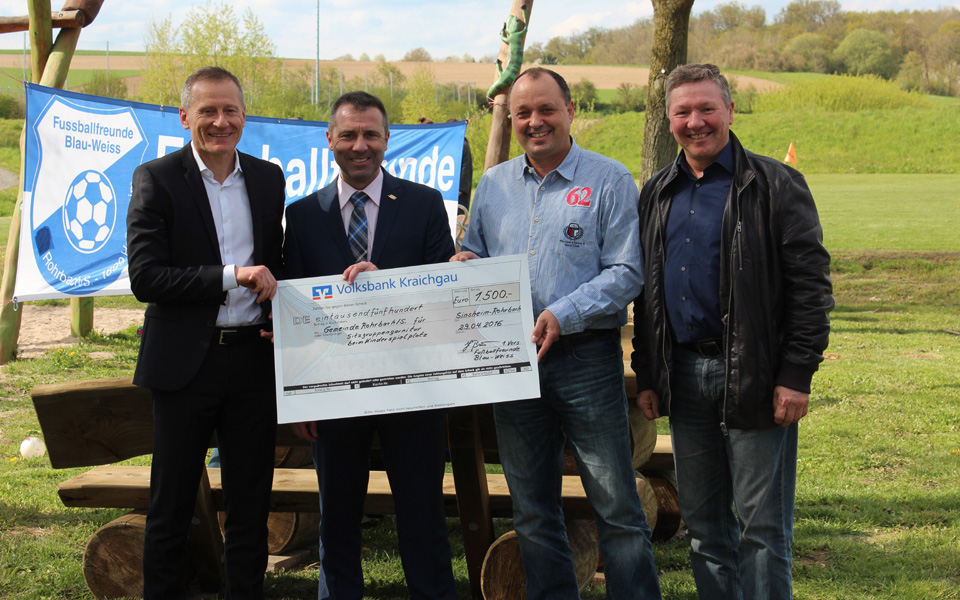 1500,- Euro haben Anschaffung und Errichtung einer Sitzgruppe auf dem Spielplatz des Neubaugebietes „Alter Sportplatz Rohrbach“ gekostet – finanziert durch die „Fußballfreunde Blau-Weiß Rohrbach/S.“, deren Vorsitzender Jürgen Bauer und Oberbürgermeister Jörg Albrecht einen entsprechenden Scheck überreichte.