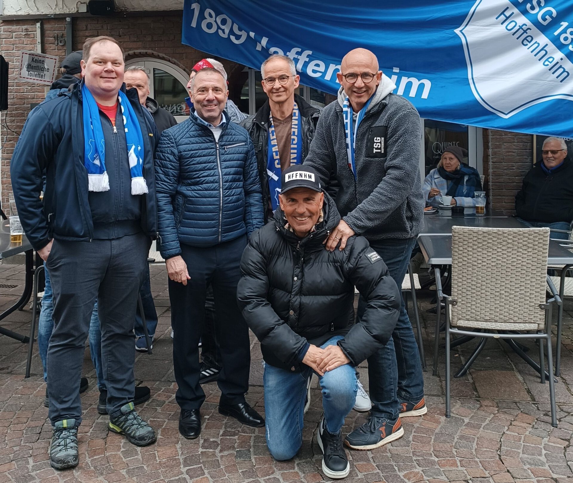 Auch TSG-Prominenz machte der Fanmeile ihre Aufwartung: TSG-Präsident Kristian Baumgärtner, Vorstandsmitglied Frank Engelhardt und Ex-Stadionsprecher Mike Diehl besuchten am Spieltag die Sinsheimer Innenstadt, mischten sich unter die Fußballfans und genossen gemeinsam Speisen und Getränke in der Bahnhofstraße.