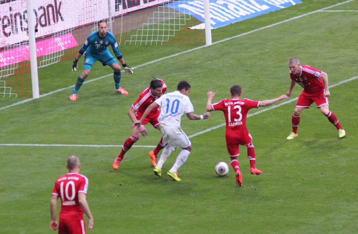 Den Gewinn ihrer 24. Deutschen Meisterschaft haben die Bayern anscheinend doch etwas ausgiebiger gefeiert. Nach 19 Siegen in Serie haben sie beim 3:3 gegen 1899 Hoffenheim die ersten Punkte seit Oktober 2013 zu Hause vergeben. Die Kraichgauer verlangten dem unbesiegbaren Champion durch ein bedingungsloses, laufintensives Spiel mit aggressivem Pressing alles ab und wurden für ihren mutigen Auftritt am Ende mit dem ersten Punktgewinn in der Allianz-Arena, nach zuvor deftigen Klatschen, belohnt. Die Begeisterung der 4.700 mitgereisten Blau-Weiß-Sympathisanten war nach dem Erreichten entsprechend groß. Ungewöhnlich, dass die ansonsten souveränen Bayern einen Zwei-Tore-Vorsprung in ihrem Fußball-Wohnzimmer noch abgeben. Mit ein wenig Glück, bei besserer Chancenverwertung, wäre selbst ein Auswärtssieg im Bereich des möglichen gewesen.