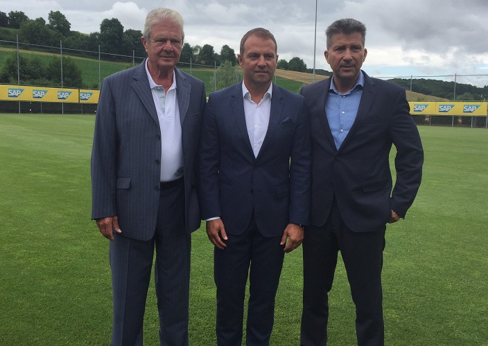 Fußball-Bundesligist TSG 1899 Hoffenheim stellte heute Hansi Flick als neuen Geschäftsführer Sport vor. Der 52-Jährige wird ab 1. Juli gemeinsam mit Frank Briel und Dr. Peter Görlich das Führungsteam der TSG 1899 Hoffenheim Fußball-Spielbetriebs GmbH bilden. Im mit 50 Medienvertretern vollbesetzten Presseraum im Trainingszentrum in Zuzenhausen, bei dem neben Flick auch TSG-Gesellschafter Dietmar Hopp auf dem Podium Platz nahm, wurden in einer 40-minütigen Pressekonferenz die neuen Strukturen ausführlich erläutert. Hopp machte gleich zu Beginn deutlich, was die Personalie Flick für den Verein bedeutet: „Heute ist ein bedeutender Tag für die TSG. Die Verpflichtung von Hansi Flick als Geschäftsführer ist ein Meilenstein auf dem Weg unseres Klubs. Wir sind nun auf allen Führungspositionen optimal besetzt. Mit Hansi Flick haben wir ein neues Gesicht bekommen. Er kennt im Fußball die Nachwuchs- wie die Profi-Welt gleichermaßen gut und er ist national und international bestens vernetzt. Dazu ist er regional verwurzelt und hat große Sympathiewerte. Wir sind glücklich, dass er ab dem 1. Juli für uns arbeiten wird und hoffen, dass er uns lange erhalten bleibt.“