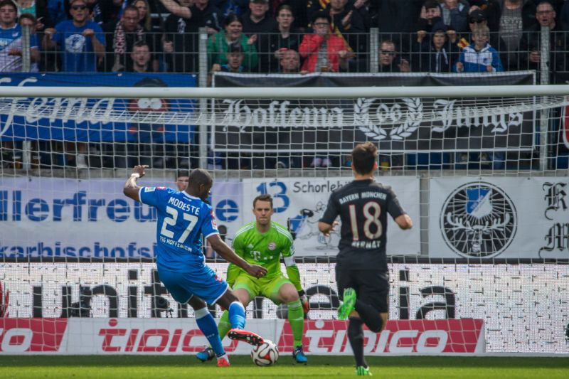 Die Gastgeber versäumten es in Führung zu gehen. Als Dante nach einem Pass von Polanski am Ball vorbei tritt, läuft Modeste völlig frei auf das Tor von Nationalmannschafts-Keeper Manuel Neuer zu. zu. Sein Schuss in der 30. Minute aus 16 Meter war jedoch zu unplatziert und wurde von Neuer per Fußabwehr geklärt. Auf der anderen Seite machte es neun Minuten später Sebastian Rode besser. Mit einem schönen Schlenzer brachte er die Gäste in Führung. Fünf Hoffenheimer standen dabei in unmittelbarer Nähe im Strafraum Spalier und ließen den Ex-Frankfurter gewähren.