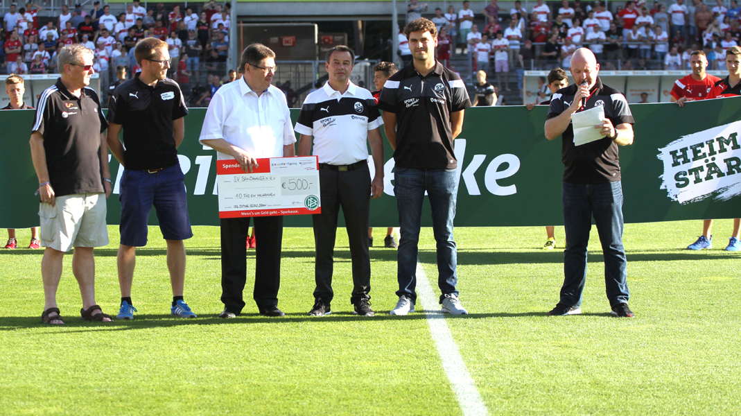 Die Besucher des Spiels gegen Stuttgart wurden schon auf dem Stadionvorplatz von den Projektteilnehmern begrüßt und mit „Heimstärke“-Flyern ausgestattet. Vor Spielbeginn überreichten Helmut Sickmüller, Vizepräsident sowie Integrationsbeauftragter des Badischen Fußballverbandes, und Johannes Kolmer, Vorsitzender des Kreises Heidelberg im Badischen Fußballverband, im Namen der DFB-Stiftung Egidius Braun einen 500 Euro-Gutschein an den SVS und ehrten den Verein damit für sein Engagement für Flüchtlinge im Rahmen des Programms „1:0 für ein Willkommen“.