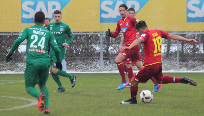 Fußball-Bundesligist 1899 Hoffenheim siegte im ersten Testspiel des neuen Jahres vor zirka 200 Zuschauern bei frostigen Temperaturen auf dem Trainingsgelände in Zuzenhausen gegen den niederländischen Erstligisten FC Groningen mit 2:1. TSG-Trainer schickte in beiden Halbzeiten total unterschiedliche Mannschaften auf das Feld. Um möglichst allen Profis Einsatzzeiten zu gewähren, schickte Trainer Julian Nagelsmann zwei komplette verschiedene Mannschaften für jeweils eine Halbzeit auf das Feld. Die Kraichgauer mussten auf Lukas Rupp (Kniebeschwerden), Jeremy Toljan (Oberschenkelprobleme), Dennis Geiger und Jiloan Hamad (absolvierten beide angeschlagen ein individuelles Programm), Alexander Stolz (Magen-Darm-Infekt) sowie dem wechselwilligen Jin-Su Kim verzichten.