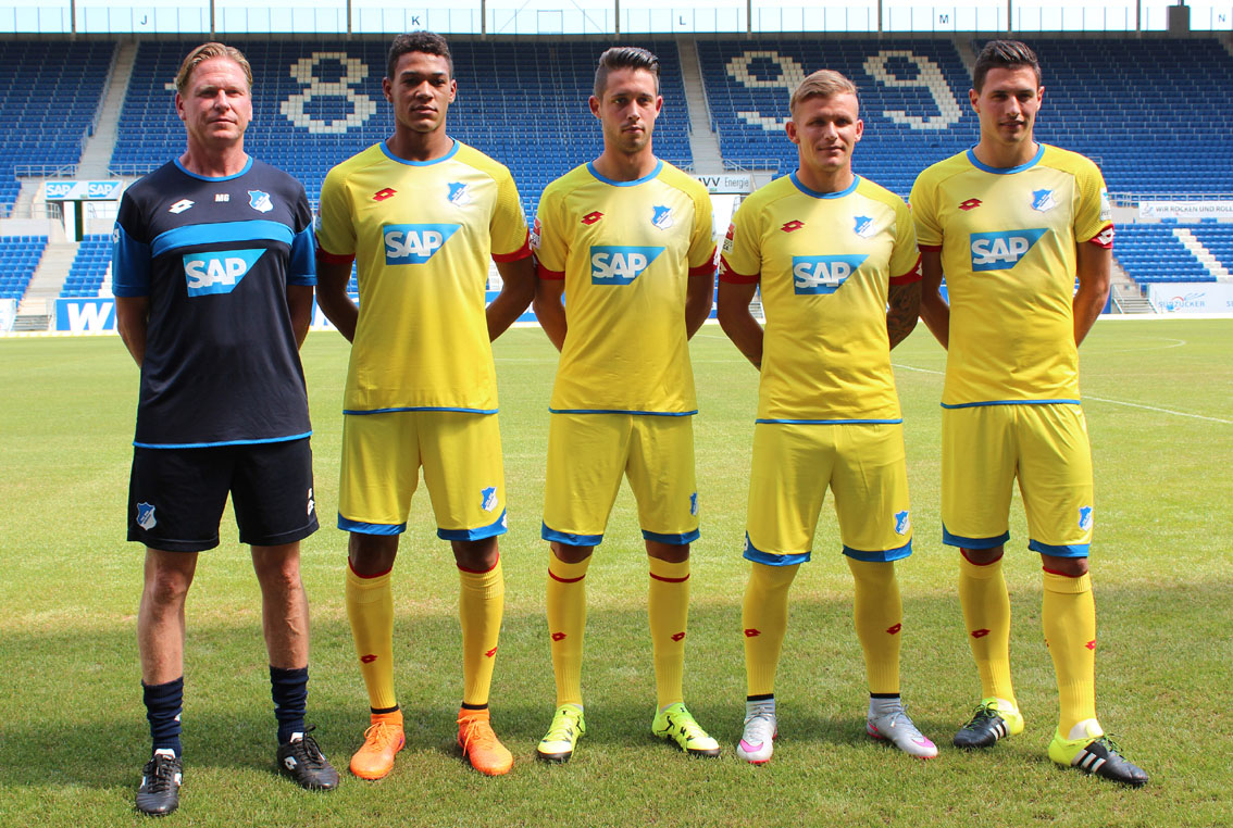 Foto: TSG-Trainer Markus Gisdol (li.) präsentiert hier seine Neuzugängen von links: Joelinton, Mark Uth, Jonathan Schmid und Fabian Schär. Außenverteidiger Pavel Kaderabek aus Prag fehlte noch.