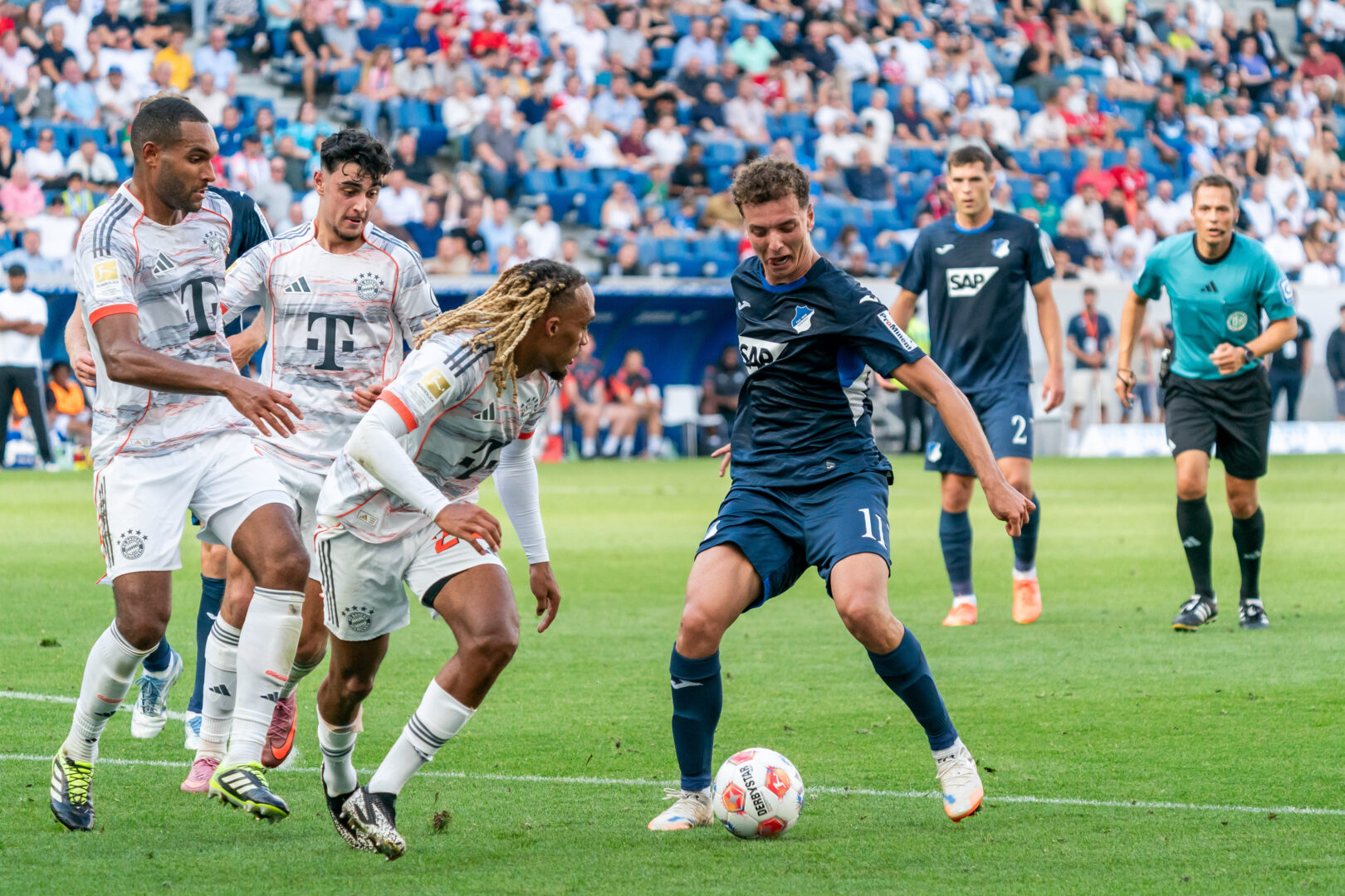 Hoffenheims Fisnik Asllani sieht sich in dieser Szene gleich drei Bayern-Spielern gegenüber