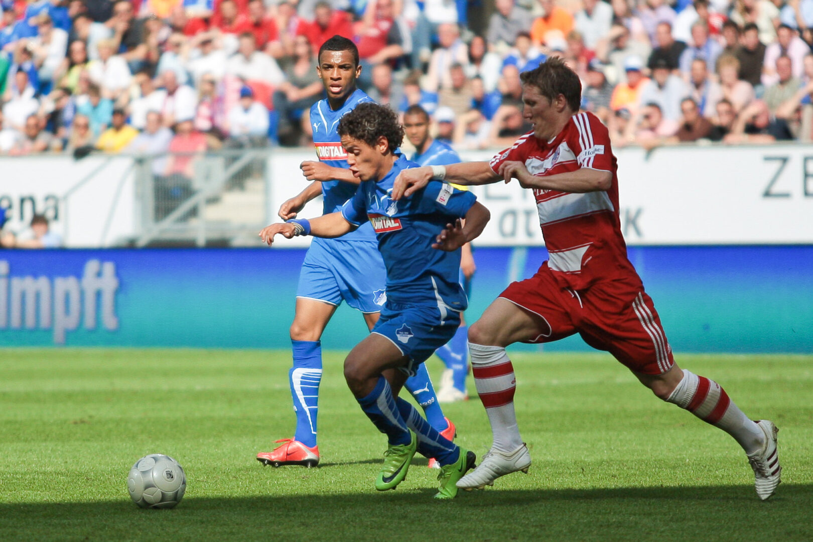 Spielszene aus der ersten Hoffenheimer Bundesliga-Saison 2008/09: Carlos Eduardo im Duell mit dem Münchner Bastian Schweinsteiger (re.). Im Hintergrund in der Beobachterrolle Luiz Gustavo.