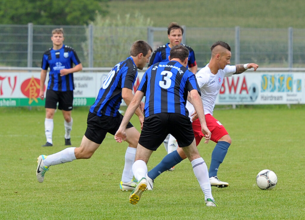 Umringt von drei Rohrbacher Gegenspielern setzt sich der Mannheimer Angreifer beim ersten Aufeinandertreffen 2014 durch.