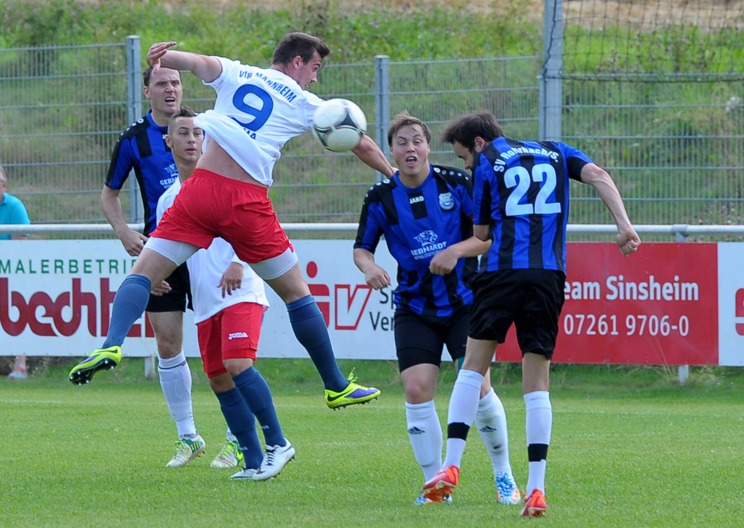 Umringt von drei Rohrbacher Gegenspielern setzt sich der Mannheimer Angreifer beim ersten Aufeinandertreffen 2014 durch.