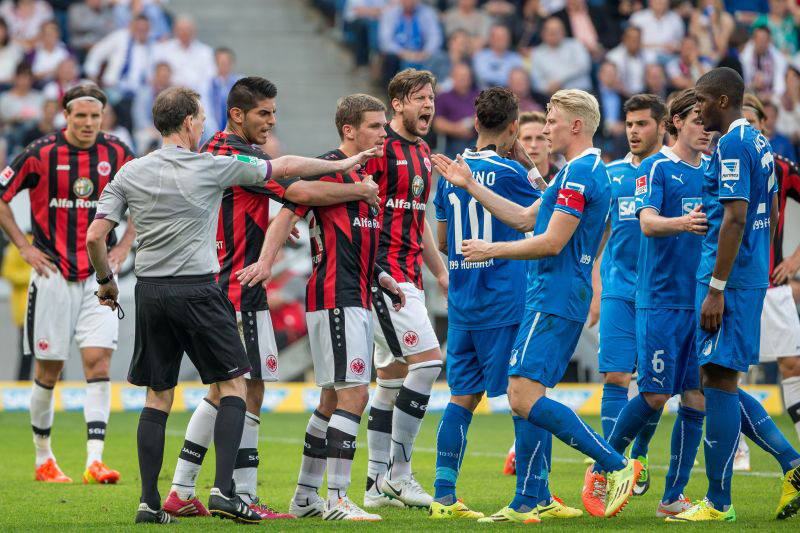 Die Schlussphase nun besonders hektisch. Nachdem zuvor einige Male der Frankfurter Carlos Zambrano und Modeste aneinander gerieten, ließ sich der Hoffenheimer bei einem Zweikampf zum Nachtreten hinreisen und wurde von Schiri Florian Meyer vier Minuten vor dem Ende mit Rot vom Platz gestellt. Richtigerweise hätte ihn der Peruaner dabei begleiten müssen, denn er trat in dieser Szene am Boden ebenfalls nach. Die letzten Minuten erinnerten an den WM-Klassiker aus dem Jahr 1982 im spanischen Gijón, als die deutsche und die österreichische Nationalmannschaft mit einem Nichtangriffspakt sich den Ball in den eigenen Reihen zuspielten, ohne dass der Gegner nur ansatzweise versucht dies zu unterbinden. Schiri Meyer hatte ein Einsehen und verzichtete auf eine Nachspielzeit und pfiff die Partie, die längst von einem gellenden Pfeifkonzert begleitet wurde, exakt nach 90 Minuten ab.