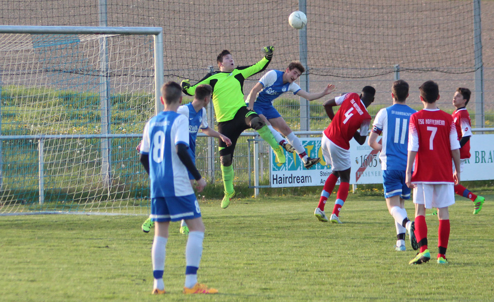 Mit einem verdienten 2:1 Heimsieg über die TSG 1899 Hoffenheim haben die B-Junioren des SV Rohrbach/S. ihre theoretische Meisterschaftschancen weiter gewahrt. In einer hektischen und nickligen Partie, mit allein in der zweiten Spielhälfte fünf Gelben- und zwei Roten Karten sowie einer Zeitstrafe, hatte Schiedsrichter Marcel Fischer viel Mühe den Überblick zu wahren.