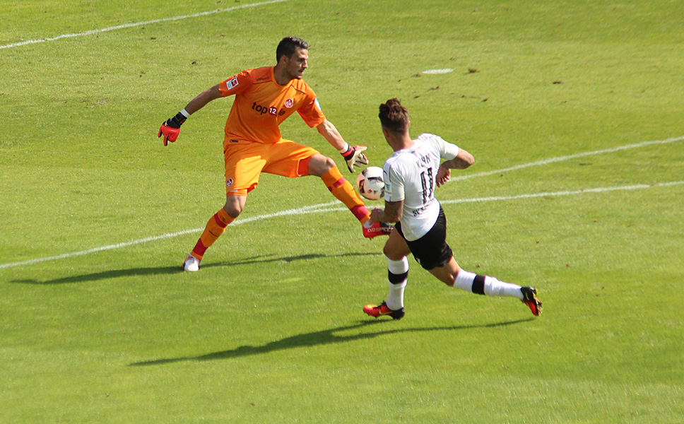 Bei hochsommerlichen Temperaturen entwickelte sich in der Folgezeit ein hart umkämpftes Duell, in dem Schiedsrichter Rohde insgesamt siebenmal Gelb und einmal Rot zückte. Es mangelte zwar an Torraumszenen, doch der Gastgeber kontrollierte in Führung das Spiel in der ersten Hälfte und hielt die Gefahr vom eigenen Tor fern. Die stärkste Phase der Lauterer war zwischen der 40. und 45. Minute. Zoltan Stieber, der mit Ungarn bei der Europameisterschaft glänzte, kam zu zwei Chancen. Zunächst zielte er neben das Tor und wenig später scheiterte er an SVS-Torhüter Marco Knaller.