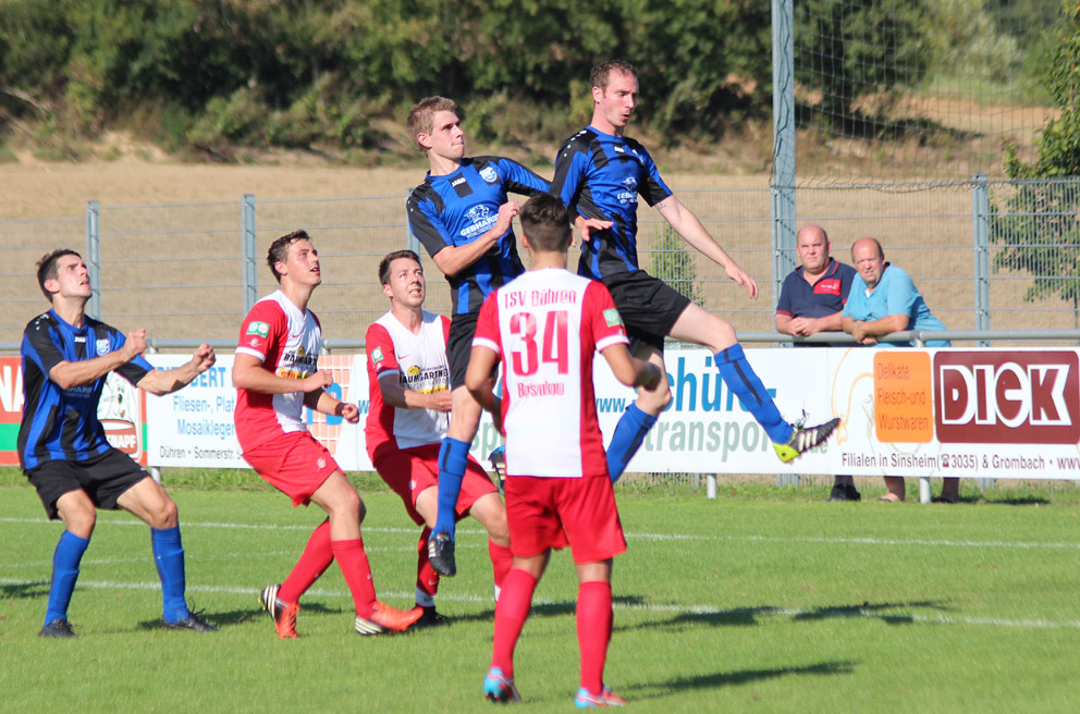 Der SV Rohrbach/S. hat sein zweites Punktspiel in der Kreisliga Sinsheim verdient mit 5:1 gegen den TSV Dühren gewonnen. Bei hohen Temperaturen gingen beide Mannschaften dennoch ein hohes Tempo. Die Gastgeber gingen in der ersten Hälfte noch etwas verhalten zur Sache, erspielten sich zwar Vorteile, waren aber bei der Chancenverwertung leichtfertig. Bruno Martins de Soussa sorgte in der 38. Minute nach schöner Einzelleistung für die knappe Pausenführung. Nachdem beide Teams einige gute Möglichkeiten ungenutzt ließen, erhöhte der SVR nach der Pause die Takt-Zahl. Ein Doppelschlag von Nils Ohlhauser entschied das Spiel. Der Wiederstand es TSV war nun gebrochen. Rohrbachs gefährlichste Angriffe gingen zu meist über Simon Dowalil auf der rechten Seite, der mit gefährlichen Flanken Soccer-Punkte sammelte. Das schönste Tor gelang Neuzugang Pajtim Boletinaj in der 68. Minute mit einem Distanzschuss aus 17 Meter in den rechten Torwinkel. Dührens Ehrentreffer, ein Eigentor, resultierte nach einem Freistoss in der 80. Minute aufgrund einer Unachtsamkeit im Strafraum. Doch die Gastgeber antworteten postwendend. Nach einer Dowalil-Flanke beförderte Martins de Soussa mit der Hacke den Ball aus kurzer Distanz über die Linie zum 5:1 Endstand. Ein in dieser Höhe verdienter Sieg der Heger-Truppe.