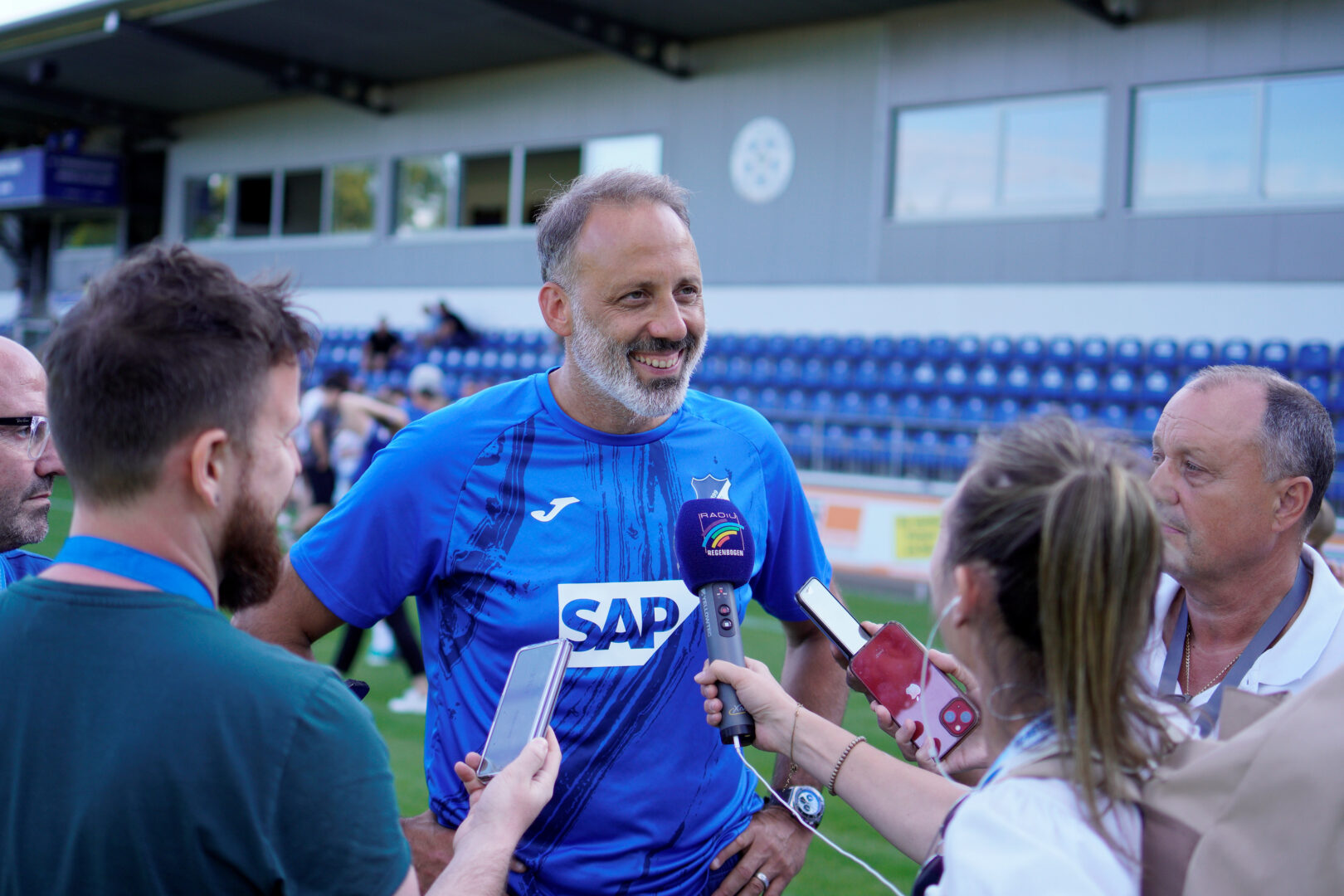 Ein gutgelaunter TSG-Coach Matarazzo im Gespräch mit einer kleinen Journalistengruppe