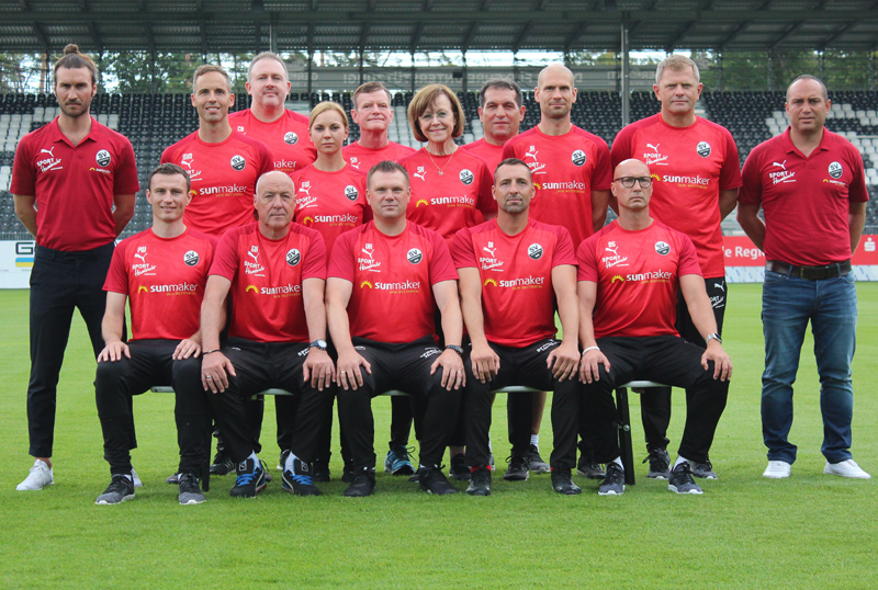 Hintere Reihe von links: Dennis Jantos (Teammanager), Markus Müller (Physiotherapeut), Christian Bieser (Physiotherapeut), Franziska Wickenhäuser (Physiotherapeutin), Dr. Pieter Beks (Mannschaftsarzt), Dr. Brigitte Michelbach (Mannschaftsärztin), Muhterem Kocaman (Teambetreuer), Joachim Krainz (Physiotherapeut), Dr. Nikolaus Streich (Mannschaftsarzt), Mikayil Kabaca (Sportlicher Leiter)