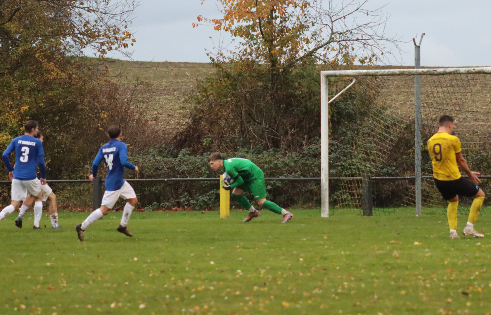 In der Folge spielte sich das Geschehen meist im Mittelfeld ab, beide Mannschaften neutralisierten sich weitgehend und die Zuschauer bekamen im Nieselregen auf dem Kirchberg wenig Unterhaltungswert geboten. Aufregung gab es dann erstmals nach 26 Minuten, als Luca Romig Sturmpartner Robin Karolus auf die Reise schickte und dieser im Treschklinger Strafraum von einem Gegenspieler zu Fall gebracht wurde, worauf der souverän leitende Schiedsrichter Allen Unterreiner sofort auf den Punkt zeigte. Joscha Rupp trat an, doch sein Schuss fischte SVT-Keeper Victor-Daniel Lascu mit einer tollen Parade aus der linken Ecke (27.).