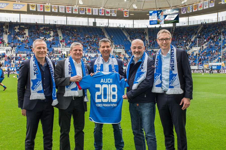 Die AUDI AG ist auch in Zukunft exklusiver Automobil-Partner des Fußball-Bundesligisten TSG 1899 Hoffenheim. Die seit 2009 bestehende Partnerschaft wird um zwei Jahre bis 2018 verlängert. „Audi ist ein in der Region fest verankerter positiver Wirtschaftsfaktor, der seit vielen Jahren seine Affinität zum Sport unter Beweis stellt“, freut sich TSG-Finanzchef Frank Briel ebenso über die Fortsetzung der Business Premium Partnerschaft wie sein Kollege aus der Geschäftsführung, Dr. Peter Görlich. „Dass Audi bis 2018 die Marke und ihre Premiummodelle auf unserer reichweitenstarken Plattform präsentiert, sehen wir auch als Anerkennung unserer Arbeit.“ Die emotionale Verbundenheit der „Audianer“, stellt TSG-Präsident Peter Hofmann heraus: „Mit dem 2009 gegründeten und ständig wachsenden Audi-Fanclub-Hoffenheim wird dies eindrucksvoll dokumentiert“, erklärt Hofmann.
