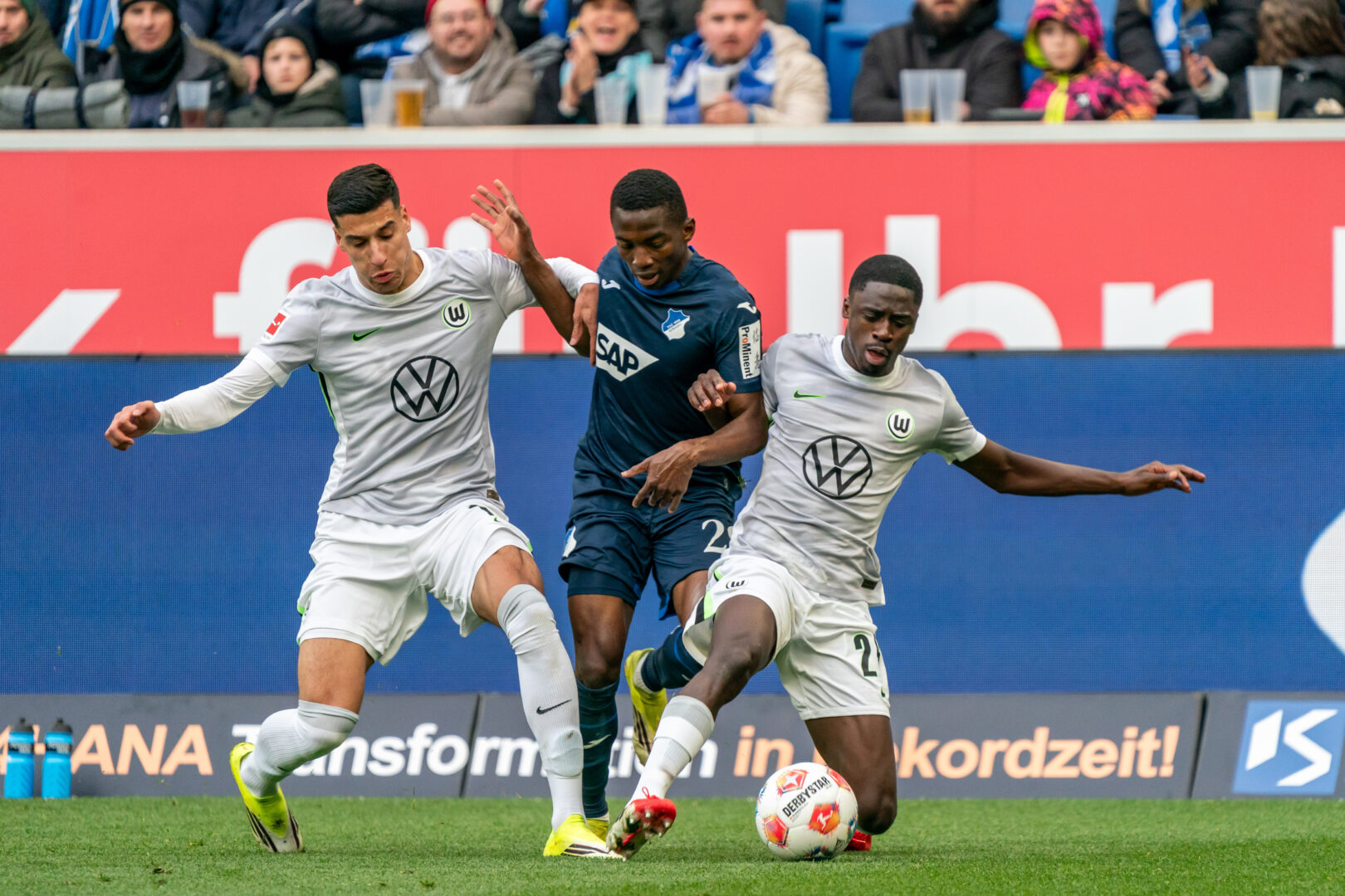 Hoffenheims pfeilschneller Außenstürmer Toure wird hier gleich von zwei Wolfsburgern in die Zange genommen