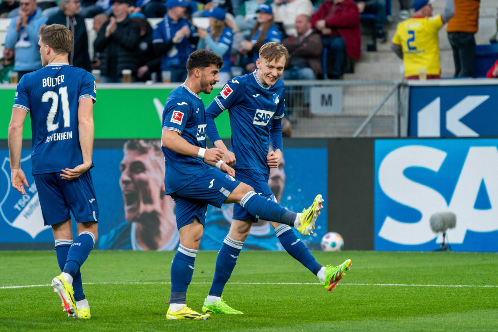 Es ging weiter im Einbahnstraßenfußball in Richtung 98er Tor. Wieder war es Grillitsch, der auf der rechten Seite Kaderabek bedient, der in den Strafraum dribbelte und aus ganz spitzem Winkel auf 3:0 erhöhte (22.). Die fast alle in weiß gekleideten Hoffe-Fans im vollen Gästeblock waren aus dem Häuschen und machten mächtig Stimmung.