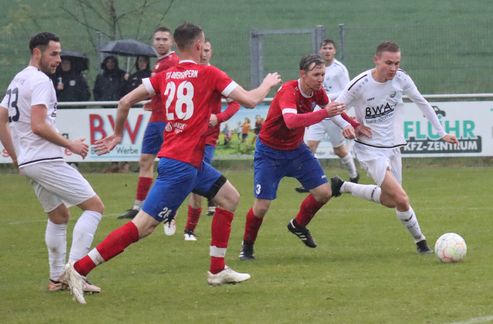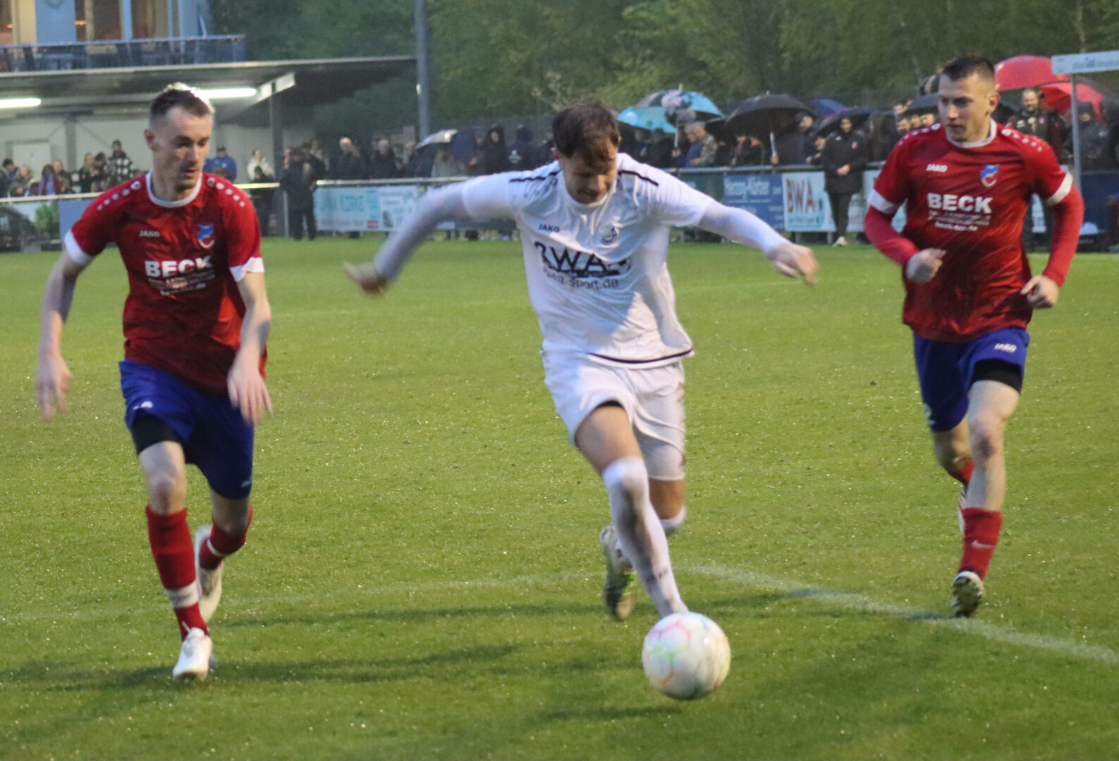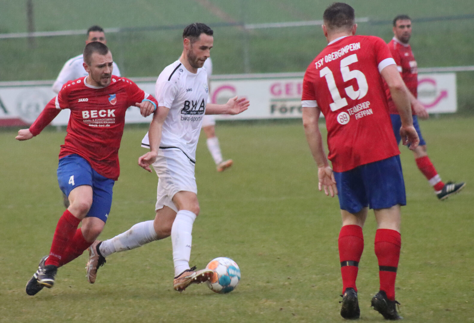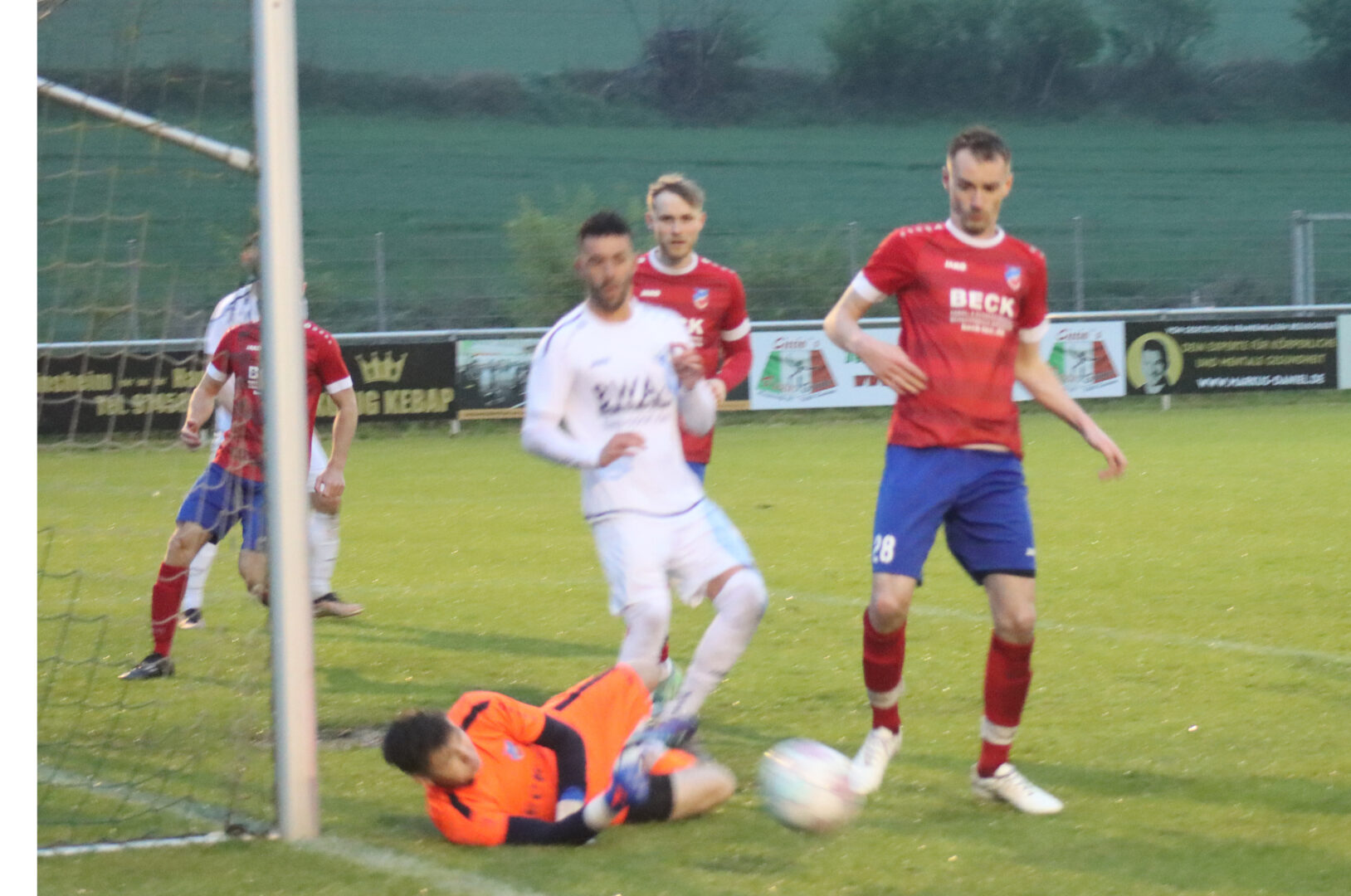 Zum Spielverlauf: Bei nasskaltem Aprilwetter und Dauerregen bekamen die Zuschauer in der ersten Hälfte wenig Unterhaltsames geboten. Während die Gäste mit einer gut gestaffelten und sicheren Hintermannschaft dem Gegner kaum Tormöglichkeiten boten, versuchten sie mit langen hohen Bällen für Entlastungsangriffe zu sorgen. Die Gastgeber fanden trotz deutlich mehr Ballbesitz kein geeignetes Mittel, um Torchancen zu kreieren. Das umkämpfte Geschehen spielte sich weitgehend zwischen beiden Strafräumen ab. Bis auf einen Freistoß von der linken Seite durch Christian Heinlein, den TSV-Keeper Luca Scholz übers Lattenkreuz lenkte (45.+2), gab es keine nennenswerten Höhepunkte.