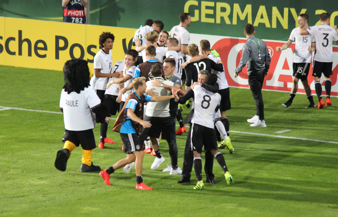 Die deutschen U19-Junioren haben bei der Europameisterschaft in Baden-Württemberg die Qualifikation für die U20-Weltmeisterschaft 2017 in Südkorea geschafft. Gegen die Niederlande gewann die DFB-Auswahl im Spiel um Platz fünf im Sandhäuser Hardtwaldstadion vor 8.592 begeisternden Zuschauern in einem dramatischen und nervenaufreibenden Elfmeterschießen 8:7 (3:3 nach 120 Min.). „Die Jungs haben wahnsinnigen Aufwand betrieben. Ich bin unheimlich stolz auf die Burschen, wir waren schon fast am Boden“, sagte DFB-Trainer Guido Streichsbier nach der Partie. Erinnerungen wurden wach an den EM-Auftakt beim 0:1 in Stuttgart gegen Italien. Deutschland dominierte, hatte deutlich mehr Tormöglichkeiten und der Gegner dreht mit seinen beiden einzigen Torchancen die Partie in der Schlussphase.