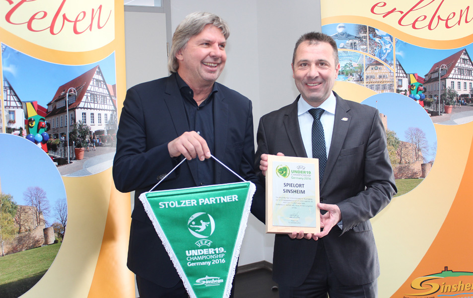 So war auch eine Abordnung in Person von Ronny Zimmermann (DFB-Vizepräsident), Kyung-Yiub Lee (DFB-Turnierdirektor) und Peter Scheffler (U19-Pressesprecher) bei OB Jörg Albrecht im Sinsheimer Rathaus, um über den aktuellen Stand der Vorbereitungen zu berichten und zu guter Letzt die Spielortplakette zu übereichen.