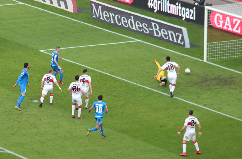 Ein packendes und spannendes schwäbisch-badisches Duell zwischen dem VfB Stuttgart und der TSG Hoffenheim blieb ohne Sieger. Die Kraichgauer konnten gegen kampfstarke Schwaben ihre spielerische Überlegenheit mit der deutlichen Mehrzahl an guter Tormöglichkeiten nicht mit einem Sieg belohnen. Während der VfB es verpasste, sich mit einem Heimsieg Luft im Abstiegskampf zu verschaffen, hat die TSG einen weiteren Rückschlag im Kampf um die Europa-League-Qualifikation erlitten. Das 1:1-Unentschieden am 26. Bundesliga-Spieltag hatte zwei relativ verschiedene Torgeschichten.