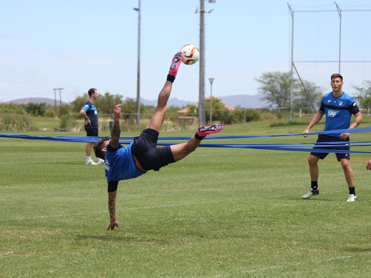 Nach dem 2:0-Testspiel-Sieg Platinum Stars und den harten Einheiten der vorherigen Tage, ging es in der morgendlichen Einheit heute etwas ruhiger zu. Nach einer kurzen Warm-up-Phase im Kraftraum und auf dem Platz hatten die Trainer am Mittwochvormittag ein Fußballtennis-Turnier organisiert. Sechs Dreierteams traten jeweils gegeneinander an. Am Ende hatte das Team von Mark Uth, Eduardo Vargas und dem jungen Philipp Ochs die meisten Punkte gesammelt und feierte einen verdienten Turniersieg, zu dem vor allem Vargas einige spektakuläre Seit- und Fallrückzieher beisteuerte. Der erste Sieg des Jahres im Testspiel gegen den südafrikanischen Erstligisten hatte auch einige unangenehme Nebeneffekte. Zu den angeschlagenen Pirmin Schwegler (Oberschenkel), Tarik Elyounoussi (Adduktoren) und Kevin Kuranyi (Sprunggelenk) hat sich auch Kevin Volland gesellt. Der Allgäuer verspürte nach einer Stunde ein Ziehen im linken Oberschenkel. Die Ärzte diagnostizierten ein leichte Zerrung, was ihn einige Tage zurückwirft.