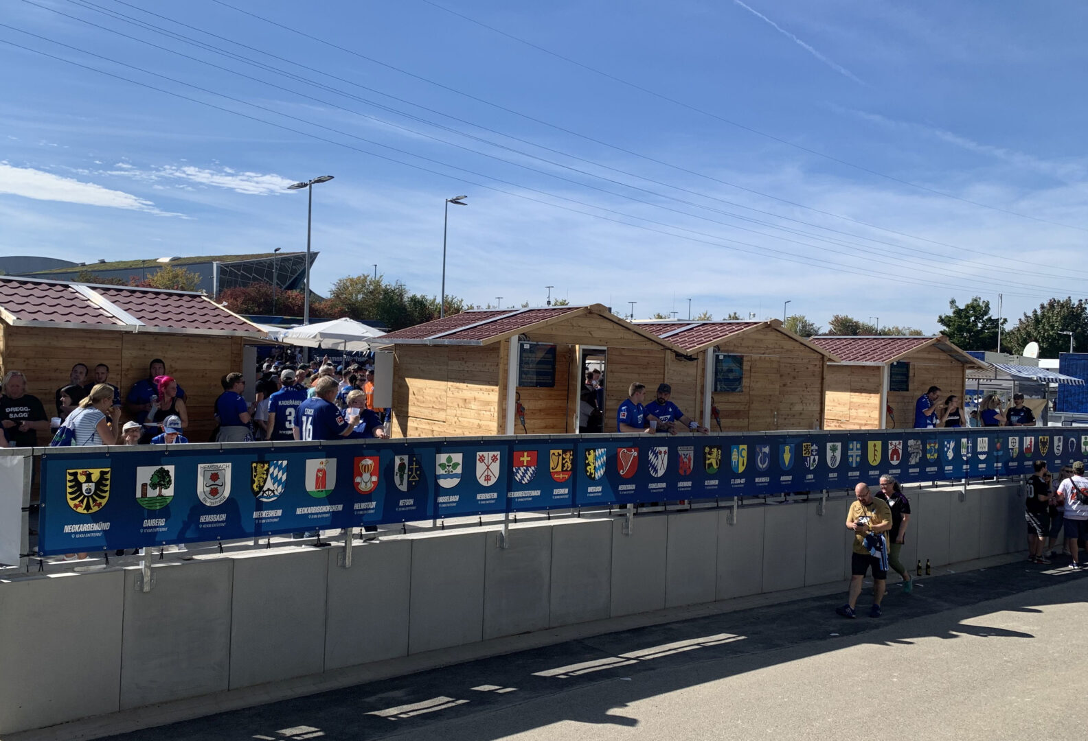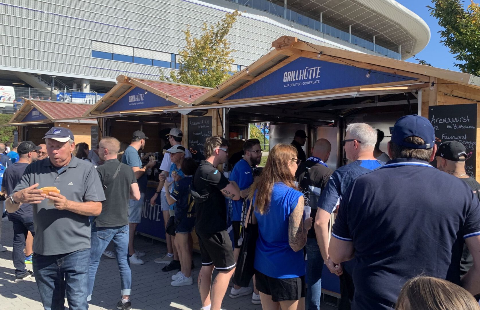 Für die Fans der TSG Hoffenheim ist mit der Einweihung des neuen Dorfplatzes auf dem Stadiongelände zwischen Südkurve und Fanhaus ein lang ersehnter Wunsch in Erfüllung gegangen. Der Andrang auf das nach dreimonatiger Bauzeit fertiggestellte Hüttendorf, das beim 2. Saisonheimspiel der Kraichgauer gegen den FC Bayern München offiziell eingeweiht wurde, war gleich am Eröffnungstag proppevoll. Die blau-weiße Anhängerschaft drängte sich geduldig beim schmalen Eingangsbereich vorbei an den Security, die nur den Hoffe-Fans mit gültiger Stadioneintrittskarte Zugang gewährten. Gästefans waren hier nicht erwünscht und wurden auch nicht gesichtet.