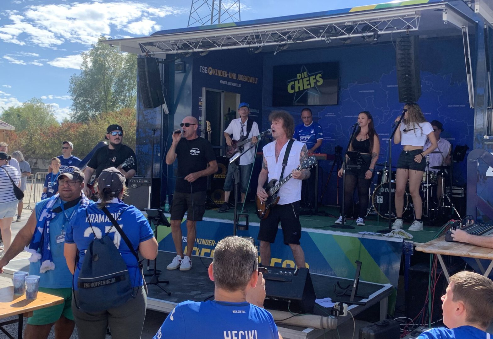 Die Stimmung bei herrlichem Sommerwetter konnte vor Spielbeginn nicht besser sein. Die Livemusik der sechsköpfigen Hoffenheimer Kultband „Die Chefs“ heizte, verstärkt durch zwei Backgroundsängerinnen, mächtig ein. Auch für die kleinen Besucher wurde am Weltkindertag mit Kinderschminken und Dosen-Werfen etwas geboten. Ein weiteres Highlight ist eine dauerhaft installierte Großleinwand, auf der Live-Spiele verfolgt werden können.