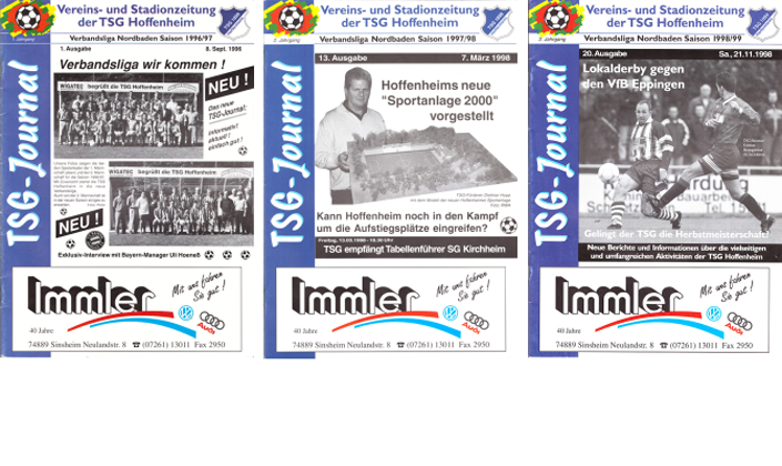 Wissen Sie eigentlich wann die erste Ausgabe einer Hoffenheimer Vereinszeitung erschien? Fast 20 Jahre ist es her, als erstmals am 8. September 1996 über die Aktivitäten und sportlichen Ereignisse der TSG Hoffenheim mit einem vereinseigenen Magazin berichtet wurde. Als damaliger Herausgeber blickt Jürgen Bauer unter der Rubrik „TSG 1899 Hoffenheim-Nostalgie“ auf drei Jahre TSG-Journal zu Verbandsliga-Zeiten zurück. Die jeweiligen Titelseiten, weitere Informationen sowie eine Übersicht über die Interviewpartner sind unter www.bwa-sport.de/tsg-nostalgie nochmals rückblickend aufgeführt. Das TSG-Journal hat einen festen Platz in der TSG-Historie eingenommen.