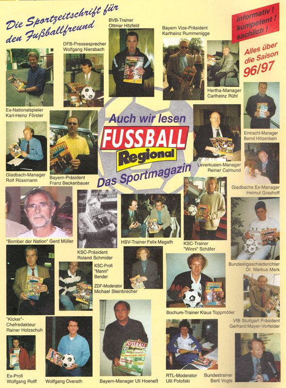 Alle Vereine, von der Kreisliga C bis zur Bundesliga, wurden in Wort und Bild mit allen wichtigen Informationen und Daten vorgestellt. Spielpläne und Interviews durften ebenso nicht fehlen, wie Berichte, Prognosen, Statistiken und Adressübersichten.