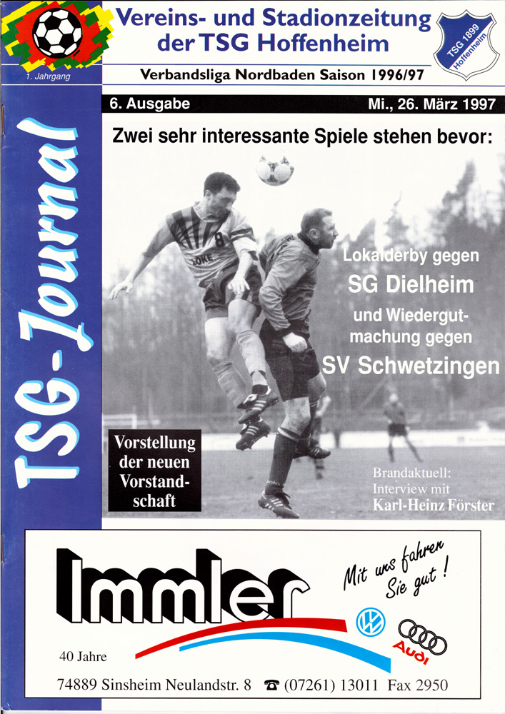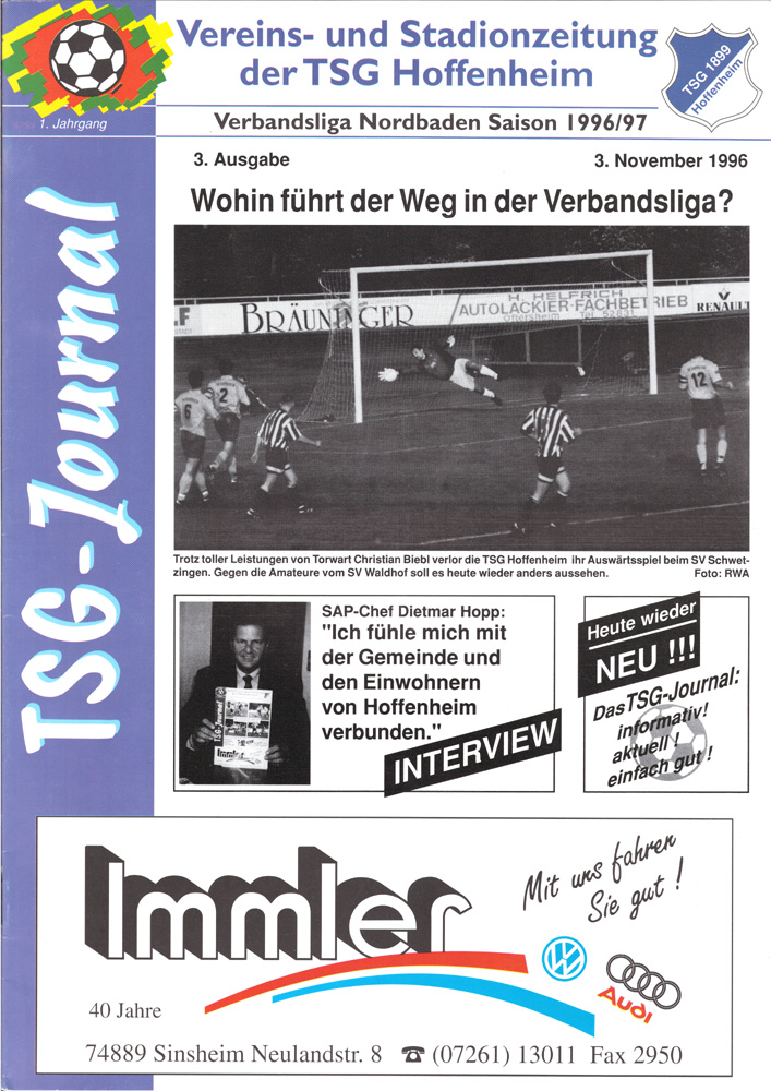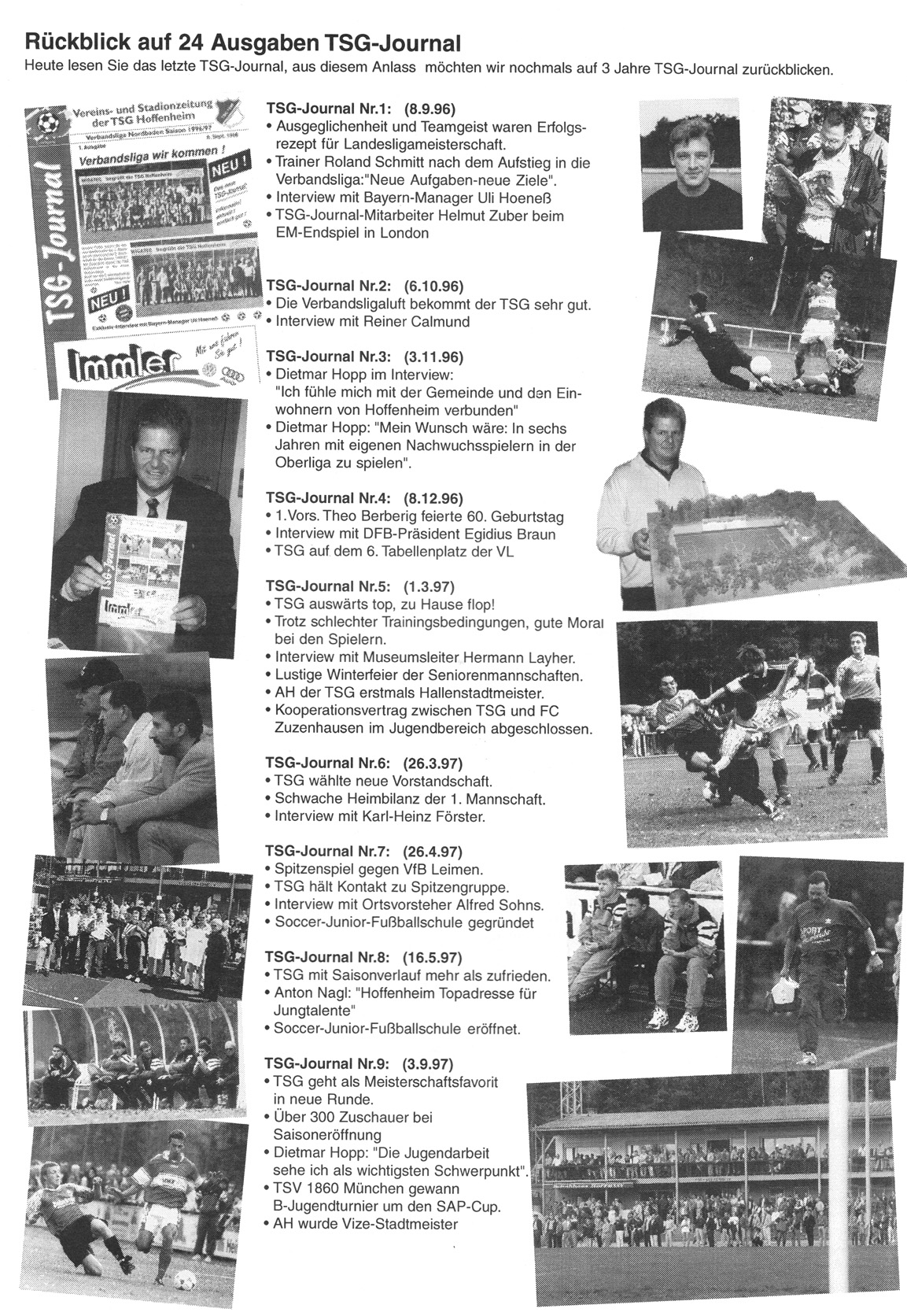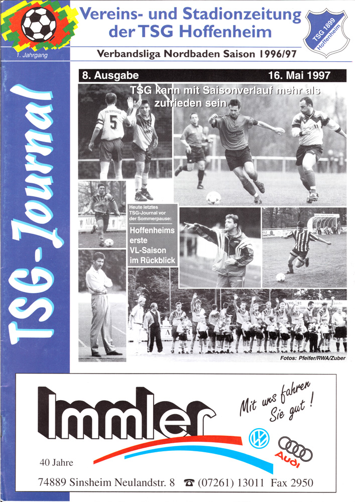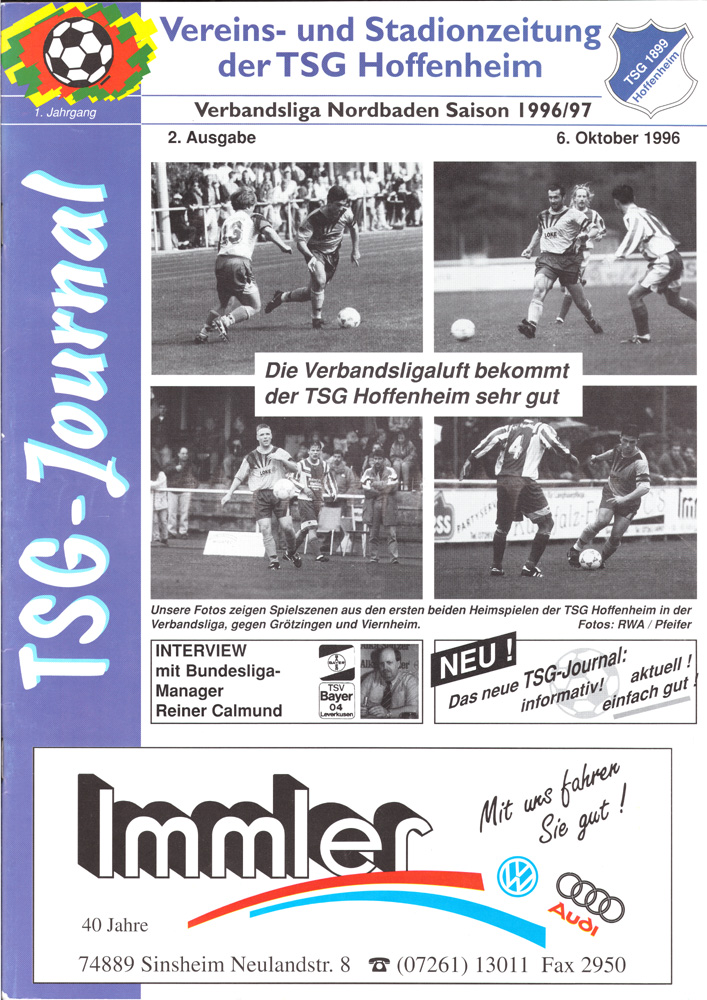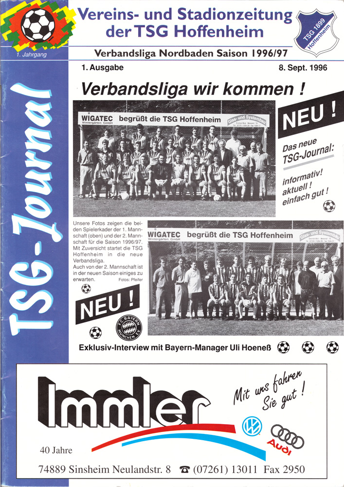 Am 8. September 1996 erschien die erste Vereinszeitung der TSG Hoffenheim – das TSG-Journal. Als Herausgeber, damals noch unter dem Firmennamen RWA-Rohrbacher Werbeagentur, blickt Jürgen Bauer sehr gerne an diese Zeit zurück. Die TSG spielte in der Verbandsliga. Dank der Unterstützung von Mäzen Dietmar Hopp waren Aufschwung, Engagement und Bereitschaft zur Mitarbeit im Verein groß. Das Zuschauerinteresse hatte sich, nicht zuletzt aufgrund der attraktiven Spielweise sowie einer überdurchschnittlich guten Mannschaft, rasch nach oben entwickelt.