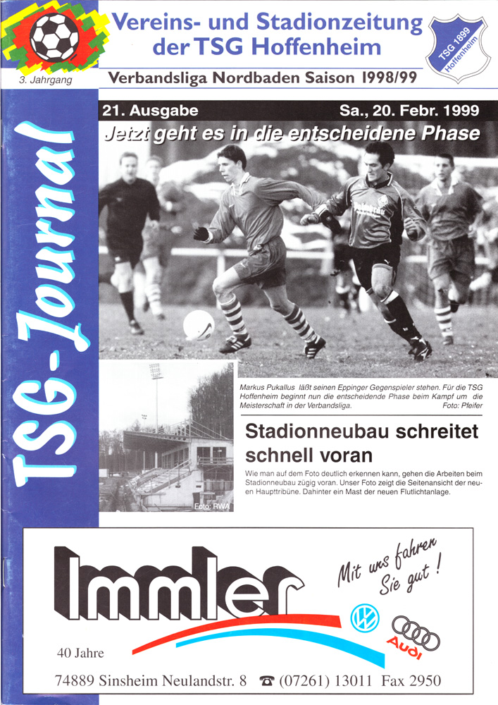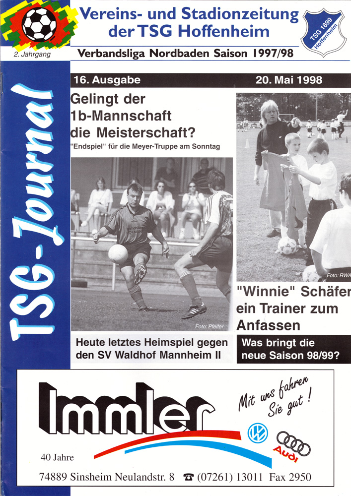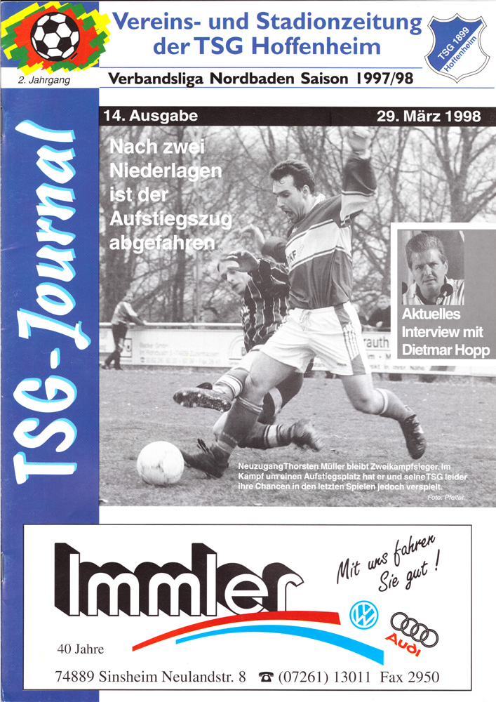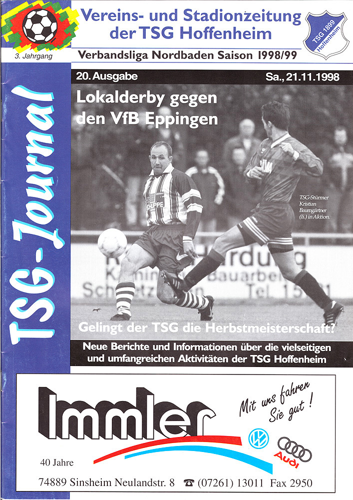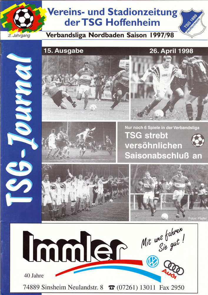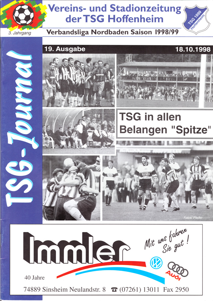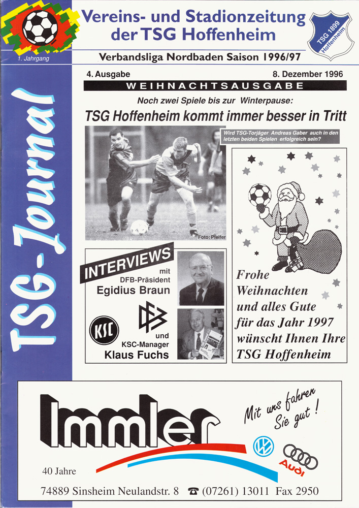 Am 8. September 1996 erschien die erste Vereinszeitung der TSG Hoffenheim – das TSG-Journal. Als Herausgeber, damals noch unter dem Firmennamen RWA-Rohrbacher Werbeagentur, blickt Jürgen Bauer sehr gerne an diese Zeit zurück. Die TSG spielte in der Verbandsliga. Dank der Unterstützung von Mäzen Dietmar Hopp waren Aufschwung, Engagement und Bereitschaft zur Mitarbeit im Verein groß. Das Zuschauerinteresse hatte sich, nicht zuletzt aufgrund der attraktiven Spielweise sowie einer überdurchschnittlich guten Mannschaft, rasch nach oben entwickelt.